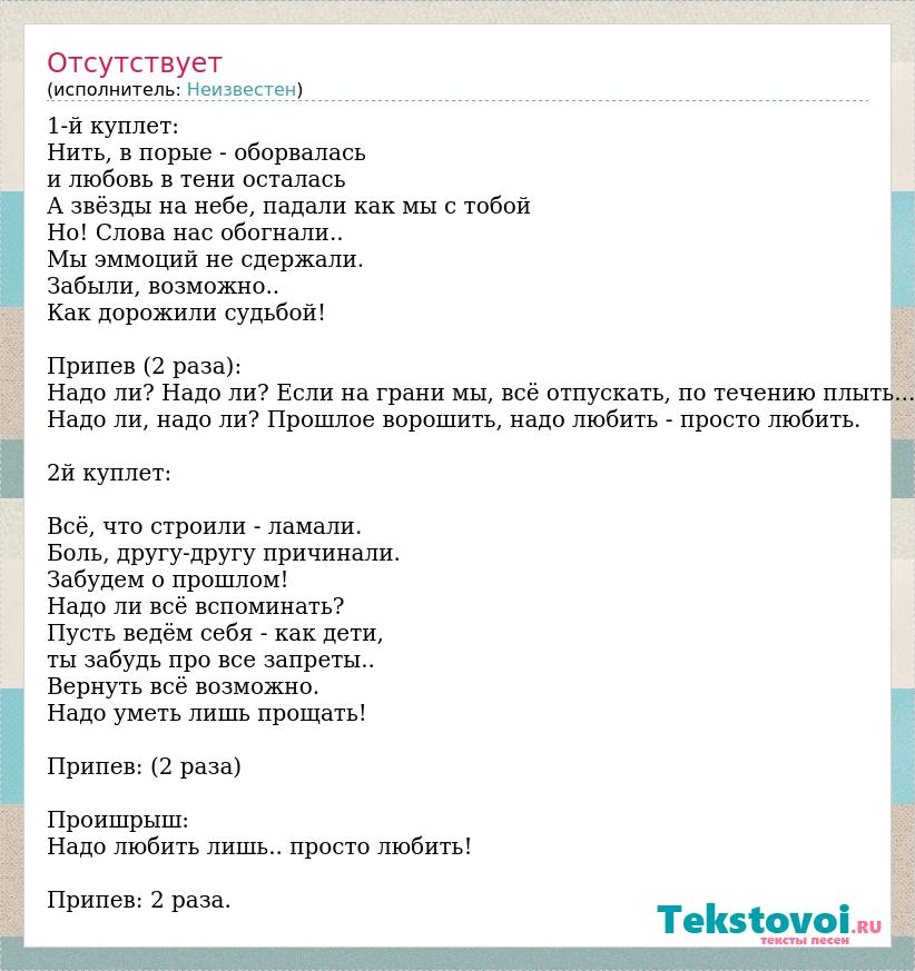 1-й куплет: Нить, в порые - оборвалась и любовь в тени осталась А звёзды на небе, падали как мы с тобой Но! Слова нас обогнали.. Мы эммоций не сдержали. Забыли, возможно.. Как дорожили судьбой! Припев (2 раза): Надо ли? Надо ли? Если на грани мы, всё отпускать, по течению плыть... Надо ли, надо ли? Прошлое ворошить, надо любить - просто любить. 2й куплет: Всё, что строили - ламали. Боль, другу-другу причинали. Забудем о прошлом! Надо ли всё вспоминать? Пусть ведём себя - как дети, ты забудь про все запреты.. Вернуть всё возможно. Надо уметь лишь прощать! Припев: (2 раза) Проишрыш: Надо любить лишь.. просто любить! Припев: 2 раза.