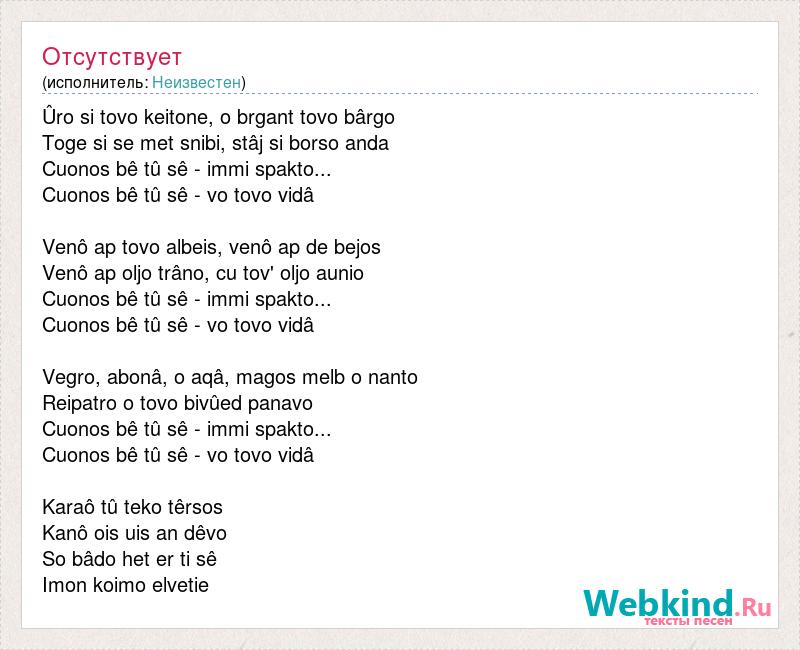 Ûro si tovo keitone, o brgant tovo bârgo Toge si se met snibi, stâj si borso anda Cuonos bê tû sê - immi spakto... Cuonos bê tû sê - vo tovo vidâ Venô ap tovo albeis, venô ap de bejos Venô ap oljo trâno, cu tov' oljo aunio Cuonos bê tû sê - immi spakto... Cuonos bê tû sê - vo tovo vidâ Vegro, abonâ, o aqâ, magos melb o nanto Reipatro o tovo bivûed panavo Cuonos bê tû sê - immi spakto... Cuonos bê tû sê - vo tovo vidâ Karaô tû teko têrsos Kanô ois uis an dêvo So bâdo het er ti sê Imon koimo elvetie