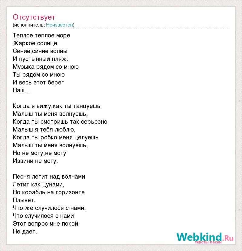 Теплое,теплое море Жаркое солнце Синие,синие волны И пустынный пляж. Музыка рядом со мною Ты рядом со мною И весь этот берег Наш... Когда я вижу,как ты танцуешь Малыш ты меня волнуешь, Когда ты смотришь так серьезно Малыш я тебя люблю. Когда ты робко меня целуешь Малыш ты меня волнуешь, Но не могу,не могу Извини не могу. Песня летит над волнами Летит как цунами, Но корабль на горизонте Плывет. Что же случилося с нами, Что случилося с нами Этот вопрос мне покой Не дает.
