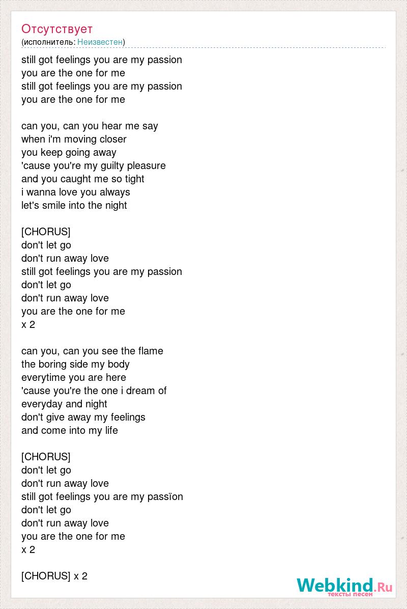 still got feelings you are my passion you are the one for me still got feelings you are my passion you are the one for me can you, can you hear me say when i'm moving closer you keep going away 'cause you're my guilty pleasure and you caught me so tight i wanna love you always let's smile into the night [bad word] don't let go [bad word] away love still got feelings you are my passion don't let go [bad word] away love you are the one for me x 2 can you, can you see the flame the boring side my body everytime you are here 'cause you're the one i dream of everyday and night don't give away my feelings [bad word] into my life [bad word] don't let go [bad word] away love still got feelings you are my passïon don't let go [bad word] away love you are the one for me x 2 [bad word] x 2