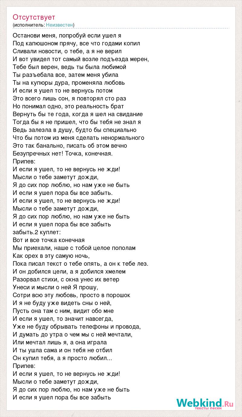 Останови меня, попробуй если ушел я Под капюшоном прячу, все что годами копил Сливали новости, о тебе, а я не верил И вот увидел тот самый возле подъезда мерен, Тебе был верен, ведь ты была любимой Ты разъебала все, затем меня убила Ты на купюры дура, променяла любовь И если я ушел то не вернусь потом Это всего лишь сон, я повторял сто раз Но понимал одно, это реальность брат Вернуть бы те года, когда я шел на свидание Тогда бы я не пришел, что бы тебя не знал я Ведь залезла в душу, будто бы специально Что бы потом из меня сделать ненормального Это так банально, писать об этом вечно Безупречных нет! Точка, конечная. Припев: И если я ушел, то не вернусь не жди! Мысли о тебе заметут дожди, Я до сих пор люблю, но нам уже не быть И если я ушел пора бы все забыть. И если я ушел, то не вернусь не жди! Мысли о тебе заметут дожди, Я до сих пор люблю, но нам уже не быть И если я ушел пора бы все забыть забыть.2 куплет: Вот и все точка конечная Мы приехали, наше с тобой целое пополам Как орех в эту самую ночь, Пока писал текст о тебе опять, а он к тебе лез. И он добился цели, а я добился хмелем Разорвал стихи, с окна унес их ветер Унеси и мысли о ней Я прошу, Сотри всю эту любовь, просто в порошок И я не буду уже видеть сны о ней, Пусть она там с ним, видит обо мне И если я ушел, то значит навсегда, Уже не буду обрывать телефоны и провода, И думать до утра о чем мы с ней мечтали, Или мечтал лишь я, а она играла И ты ушла сама и он тебя не отбил Он купил тебя, а я просто любил... Припев: И если я ушел, то не вернусь не жди! Мысли о тебе заметут дожди, Я до сих пор люблю, но нам уже не быть И если я ушел пора бы все забыть