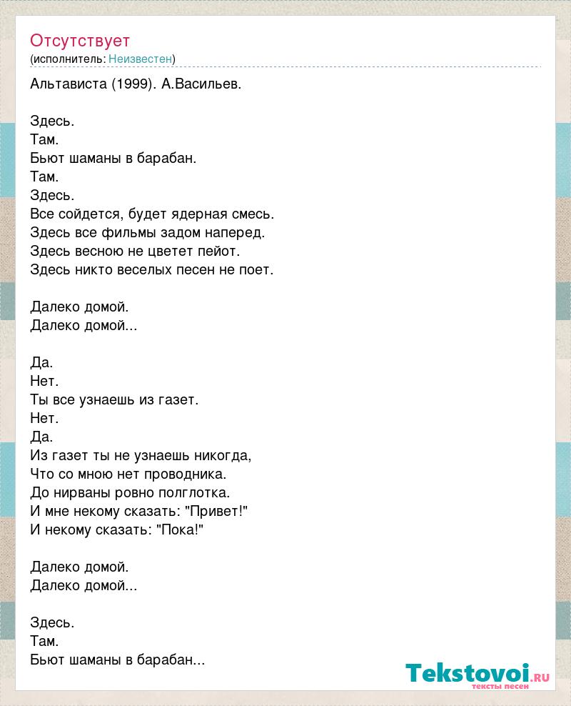 Альтависта (1999). А.Васильев. Здесь. Там. Бьют шаманы в барабан. Там. Здесь. Все сойдется, будет ядерная смесь. Здесь все фильмы задом наперед. Здесь весною не цветет пейот. Здесь никто веселых песен не поет. Далеко домой. Далеко домой... Да. Нет. Ты все узнаешь из газет. Нет. Да. Из газет ты не узнаешь никогда, Что со мною нет проводника. До нирваны ровно полглотка. И мне некому сказать: "Привет!" И некому сказать: "Пока!" Далеко домой. Далеко домой... Здесь. Там. Бьют шаманы в барабан...