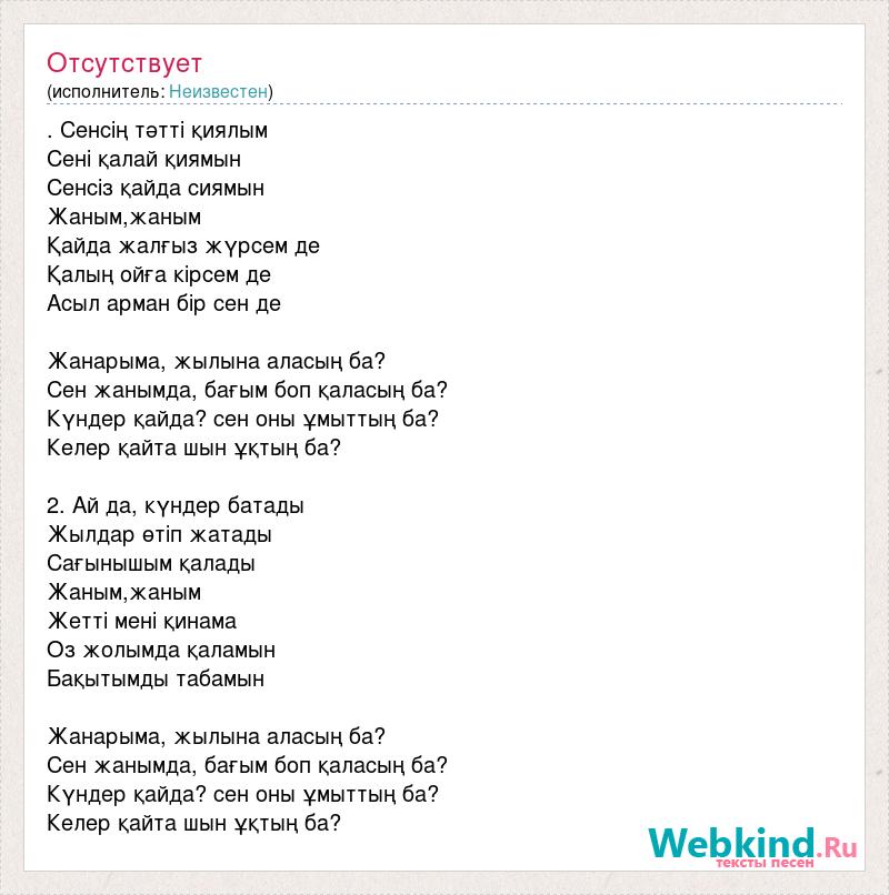 . Сенсің тәтті қиялым Сені қалай қиямын Сенсіз қайда сиямын Жаным,жаным Қайда жалғыз жүрсем де Қалың ойға кірсем де Асыл арман бір сен де Жанарыма, жылына аласың ба? Сен жанымда, бағым боп қаласың ба? Күндер қайда? сен оны ұмыттың ба? Келер қайта шын ұқтың ба? 2. Ай да, күндер батады Жылдар өтіп жатады Сағынышым қалады Жаным,жаным Жетті мені қинама Оз жолымда қаламын Бақытымды табамын Жанарыма, жылына аласың ба? Сен жанымда, бағым боп қаласың ба? Күндер қайда? сен оны ұмыттың ба? Келер қайта шын ұқтың ба?