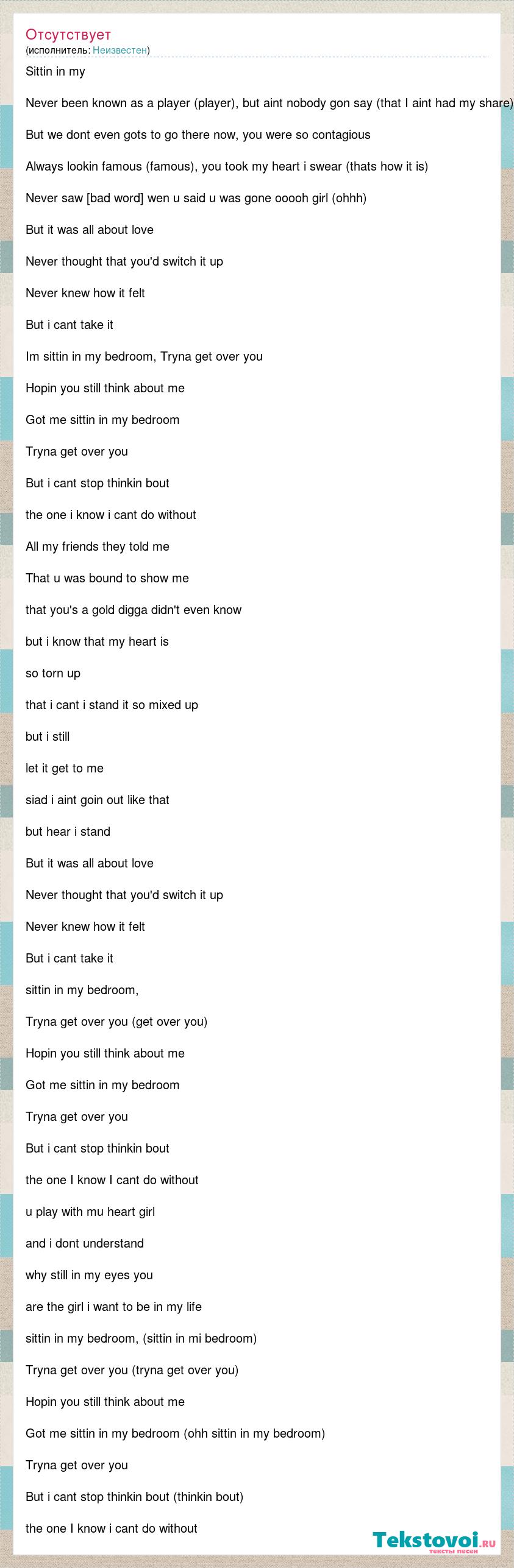 Sittin in my Never been known as a player (player), but aint nobody gon say (that I aint had my share) But we dont even gots to go there now, you were so contagious Always lookin famous (famous), you took my heart i swear (thats how it is) Never saw [bad word] wen u said u was gone ooooh girl (ohhh) But it was all about love Never thought that you'd switch it up Never knew how it felt But i cant take it Im sittin in my bedroom, Tryna get over you Hopin you still think about me Got me sittin in my bedroom Tryna get over you But i cant stop thinkin bout the one i know i cant do without All my friends they told me That u was bound to show me that you's a gold digga didn't even know but i know that my heart is so torn up that i cant i stand it so mixed up but i still let it get to me siad i aint goin out like that but hear i stand But it was all about love Never thought that you'd switch it up Never knew how it felt But i cant take it sittin in my bedroom, Tryna get over you (get over you) Hopin you still think about me Got me sittin in my bedroom Tryna get over you But i cant stop thinkin bout the one I know I cant do without u play with mu heart girl and i dont understand why still in my eyes you are the girl i want to be in my life sittin in my bedroom, (sittin in mi bedroom) Tryna get over you (tryna get over you) Hopin you still think about me Got me sittin in my bedroom (ohh sittin in my bedroom) Tryna get over you But i cant stop thinkin bout (thinkin bout) the one I know i cant do without