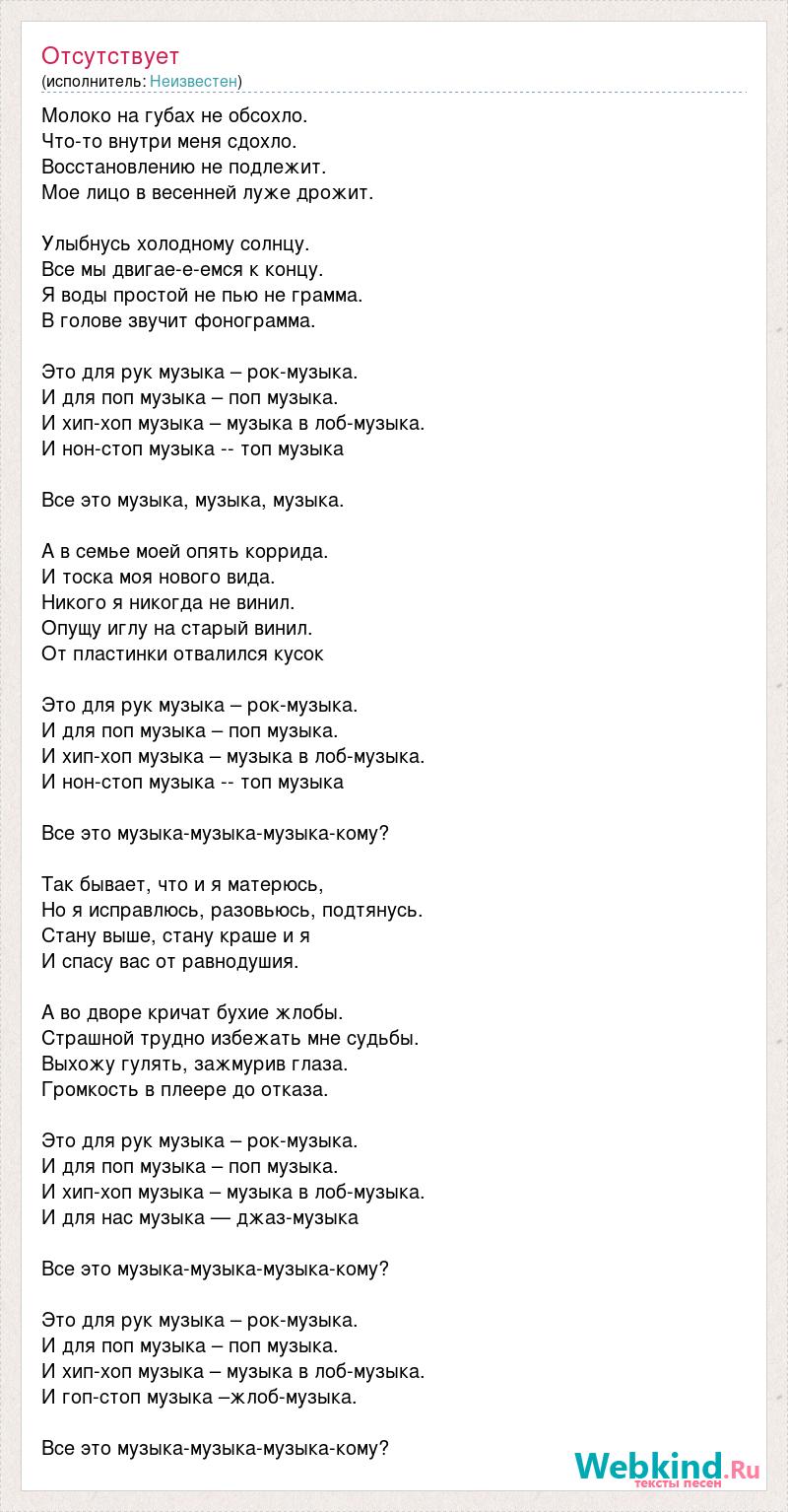 Молоко на губах не обсохло. Что-то внутри меня сдохло. Восстановлению не подлежит. Мое лицо в весенней луже дрожит. Улыбнусь холодному солнцу. Все мы двигае-е-емся к концу. Я воды простой не пью не грамма. В голове звучит фонограмма. Это для рук музыка – рок-музыка. И для поп музыка – поп музыка. И хип-хоп музыка – музыка в лоб-музыка. И нон-стоп музыка -- топ музыка Все это музыка, музыка, музыка. А в семье моей опять коррида. И тоска моя нового вида. Никого я никогда не винил. Опущу иглу на старый винил. От пластинки отвалился кусок Это для рук музыка – рок-музыка. И для поп музыка – поп музыка. И хип-хоп музыка – музыка в лоб-музыка. И нон-стоп музыка -- топ музыка Все это музыка-музыка-музыка-кому? Так бывает, что и я матерюсь, Но я исправлюсь, разовьюсь, подтянусь. Стану выше, стану краше и я И спасу вас от равнодушия. А во дворе кричат бухие жлобы. Страшной трудно избежать мне судьбы. Выхожу гулять, зажмурив глаза. Громкость в плеере до отказа. Это для рук музыка – рок-музыка. И для поп музыка – поп музыка. И хип-хоп музыка – музыка в лоб-музыка. И для нас музыка — джаз-музыка Все это музыка-музыка-музыка-кому? Это для рук музыка – рок-музыка. И для поп музыка – поп музыка. И хип-хоп музыка – музыка в лоб-музыка. И гоп-стоп музыка –жлоб-музыка. Все это музыка-музыка-музыка-кому?