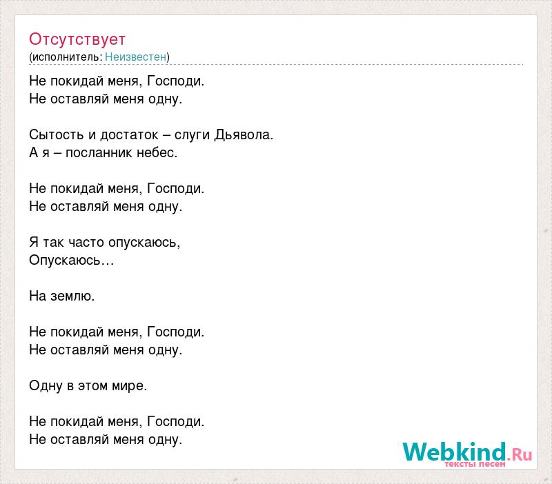 Не покидай меня, Господи. Не оставляй меня одну. Сытость и достаток – слуги Дьявола. А я – посланник небес. Не покидай меня, Господи. Не оставляй меня одну. Я так часто опускаюсь, Опускаюсь… На землю. Не покидай меня, Господи. Не оставляй меня одну. Одну в этом мире. Не покидай меня, Господи. Не оставляй меня одну.