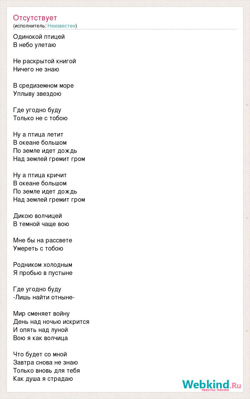 Одинокой птицей В небо улетаю Не раскрытой книгой Ничего не знаю В средиземном море Уплыву звездою Где угодно буду Только не с тобою Ну а птица летит В океане большом По земле идет дождь Над землей гремит гром Ну а птица кричит В океане большом По земле идет дождь Над землей гремит гром Дикою волчицей В темной чаще вою Мне бы на рассвете Умереть с тобою Родником холодным Я пробью в пустыне Где угодно буду -Лишь найти отныне- Мир сменяет войну День над ночью искрится И опять над луной Вою я как волчица Что будет со мной Завтра снова не знаю Только вновь для тебя Как душа я страдаю