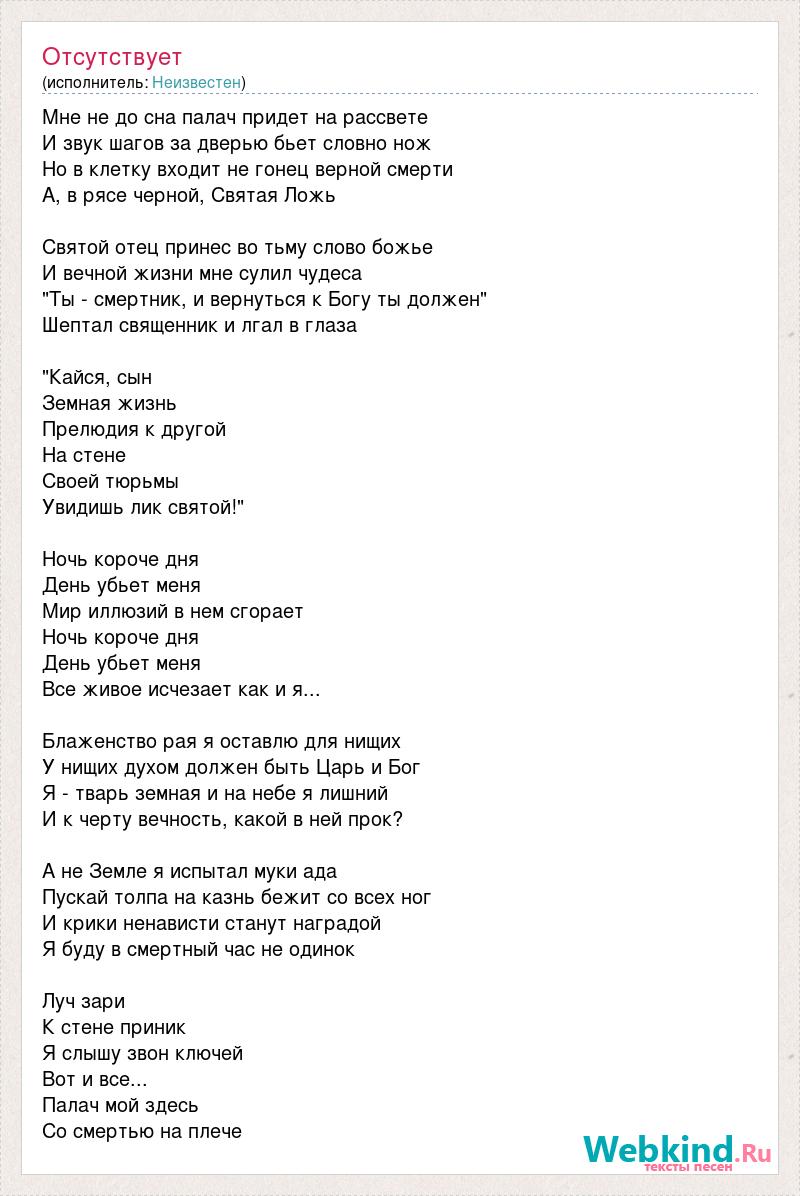 Мне не до сна палач придет на рассвете И звук шагов за дверью бьет словно нож Но в клетку входит не гонец верной смерти А, в рясе черной, Святая Ложь Святой отец принес во тьму слово божье И вечной жизни мне сулил чудеса "Ты - смертник, и вернуться к Богу ты должен" Шептал священник и лгал в глаза "Кайся, сын Земная жизнь Прелюдия к другой На стене Своей тюрьмы Увидишь лик святой!" Ночь короче дня День убьет меня Мир иллюзий в нем сгорает Ночь короче дня День убьет меня Все живое исчезает как и я... Блаженство рая я оставлю для нищих У нищих духом должен быть Царь и Бог Я - тварь земная и на небе я лишний И к черту вечность, какой в ней прок? А не Земле я испытал муки ада Пускай толпа на казнь бежит со всех ног И крики ненависти станут наградой Я буду в смертный час не одинок Луч зари К стене приник Я слышу звон ключей Вот и все... Палач мой здесь Со смертью на плече