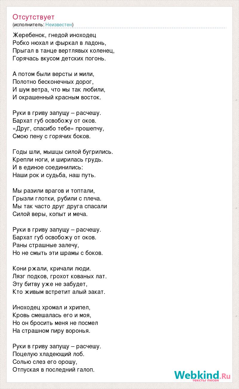 Жеребенок, гнедой иноходец Робко нюхал и фыркал в ладонь, Прыгал в танце вертлявых коленец, Горячась вкусом детских погонь. А потом были версты и мили, Полотно бесконечных дорог, И шум ветра, что мы так любили, И окрашенный красным восток. Руки в гриву запущу – расчешу. Бархат губ освобожу от оков. «Друг, спасибо тебе» прошепчу, Смою пену с горячих боков. Годы шли, мышцы силой бугрились. Крепли ноги, и ширилась грудь. И в единое соединились: Наши рок и судьба, наш путь. Мы разили врагов и топтали, Грызли глотки, рубили с плеча. Мы так часто друг друга спасали Силой веры, копыт и меча. Руки в гриву запущу – расчешу. Бархат губ освобожу от оков. Раны страшные залечу, Но не смыть эти шрамы с боков. Кони ржали, кричали люди. Лязг подков, грохот кованых лат. Эту битву уже не забудет, Кто живым встретит алый закат. Иноходец хромал и хрипел, Кровь смешалась его и моя, Но он бросить меня не посмел На страшном пиру воронья. Руки в гриву запущу – расчешу. Поцелую хладеющий лоб. Солью слез его орошу, Отпуская в последний галоп.