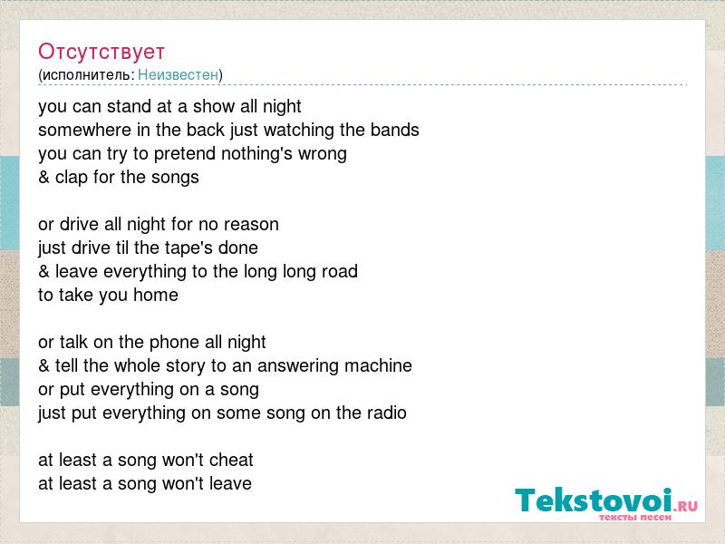 you can stand at a show all night somewhere in the back just watching the bands you can try to pretend nothing's wrong & clap for the songs or drive all night for no reason just drive til the tape's done & leave everything to the long long road to take you home or talk on the phone all night & tell the whole story to an answering machine or put everything on a song just put everything on some song on the radio at least a song won't cheat at least a song won't leave