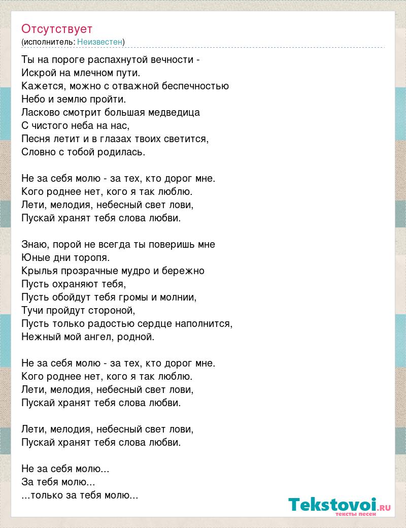 Ты на пороге распахнутой вечности - Искрой на млечном пути. Кажется, можно с отважной беспечностью Небо и землю пройти. Ласково смотрит большая медведица С чистого неба на нас, Песня летит и в глазах твоих светится, Словно с тобой родилась. Не за себя молю - за тех, кто дорог мне. Кого роднее нет, кого я так люблю. Лети, мелодия, небесный свет лови, Пускай хранят тебя слова любви. Знаю, порой не всегда ты поверишь мне Юные дни торопя. Крылья прозрачные мудро и бережно Пусть охраняют тебя, Пусть обойдут тебя громы и молнии, Тучи пройдут стороной, Пусть только радостью сердце наполнится, Нежный мой ангел, родной. Не за себя молю - за тех, кто дорог мне. Кого роднее нет, кого я так люблю. Лети, мелодия, небесный свет лови, Пускай хранят тебя слова любви. Лети, мелодия, небесный свет лови, Пускай хранят тебя слова любви. Не за себя молю... За тебя молю... ...только за тебя молю...