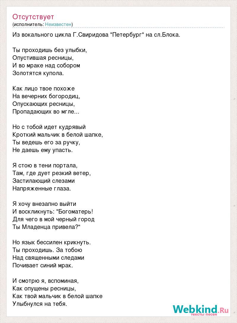 Из вокального цикла Г.Свиридова "Петербург" на сл.Блока. Ты проходишь без улыбки, Опустившая ресницы, И во мраке над собором Золотятся купола. Как лицо твое похоже На вечерних богородиц, Опускающих ресницы, Пропадающих во мгле... Но с тобой идет кудрявый Кроткий мальчик в белой шапке, Ты ведешь его за ручку, Не даешь ему упасть. Я стою в тени портала, Там, где дует резкий ветер, Застилающий слезами Напряженные глаза. Я хочу внезапно выйти И воскликнуть: "Богоматерь! Для чего в мой черный город Ты Младенца привела?" Но язык бессилен крикнуть. Ты проходишь. За тобою Над священными следами Почивает синий мрак. И смотрю я, вспоминая, Как опущены ресницы, Как твой мальчик в белой шапке Улыбнулся на тебя.