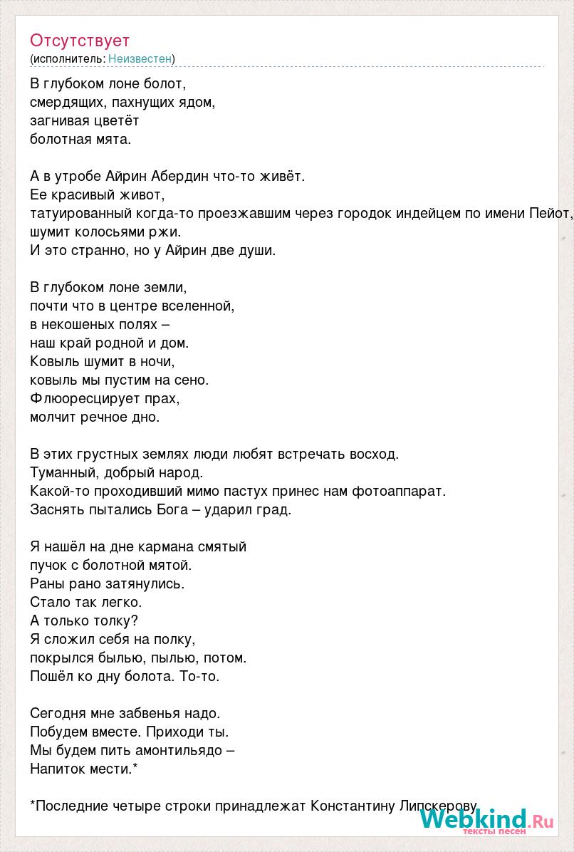 В глубоком лоне болот, смердящих, пахнущих ядом, загнивая цветёт болотная мята. А в утробе Айрин Абердин что-то живёт. Ее красивый живот, татуированный когда-то проезжавшим через городок индейцем по имени Пейот, шумит колосьями ржи. И это странно, но у Айрин две души. В глубоком лоне земли, почти что в центре вселенной, в некошеных полях – наш край родной и дом. Ковыль шумит в ночи, ковыль мы пустим на сено. Флюоресцирует прах, молчит речное дно. В этих грустных землях люди любят встречать восход. Туманный, добрый народ. Какой-то проходивший мимо пастух принес нам фотоаппарат. Заснять пытались Бога – ударил град. Я нашёл на дне кармана смятый пучок с болотной мятой. Раны рано затянулись. Стало так легко. А только толку? Я сложил себя на полку, покрылся былью, пылью, потом. Пошёл ко дну болота. То-то. Сегодня мне забвенья надо. Побудем вместе. Приходи ты. Мы будем пить амонтильядо – Напиток мести.* *Последние четыре строки принадлежат Константину Липскерову.