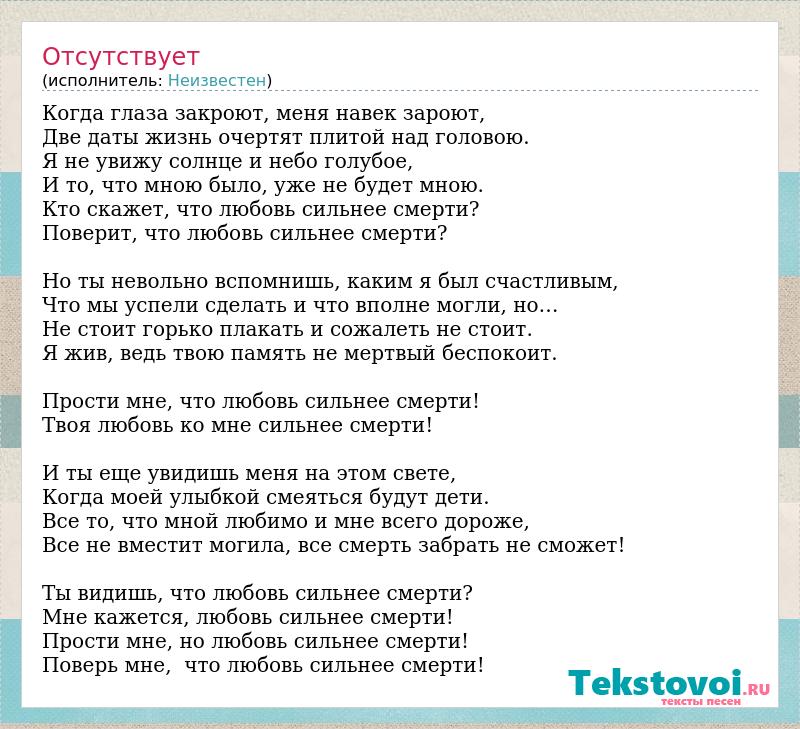 Когда глаза закроют, меня навек зароют, Две даты жизнь очертят плитой над головою. Я не увижу солнце и небо голубое, И то, что мною было, уже не будет мною. Кто скажет, что любовь сильнее смерти? Поверит, что любовь сильнее смерти? Но ты невольно вспомнишь, каким я был счастливым, Что мы успели сделать и что вполне могли, но… Не стоит горько плакать и сожалеть не стоит. Я жив, ведь твою память не мертвый беспокоит. Прости мне, что любовь сильнее смерти! Твоя любовь ко мне сильнее смерти! И ты еще увидишь меня на этом свете, Когда моей улыбкой смеяться будут дети. Все то, что мной любимо и мне всего дороже, Все не вместит могила, все смерть забрать не сможет! Ты видишь, что любовь сильнее смерти? Мне кажется, любовь сильнее смерти! Прости мне, но любовь сильнее смерти! Поверь мне, что любовь сильнее смерти!