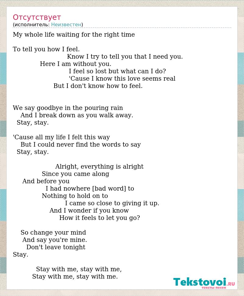 My whole life waiting for the right time To tell you how I feel. Know I try to tell you that I need you. Here I am without you. I feel so lost but what can I do? 'Cause I know this love seems real But I don't know how to feel. We say goodbye in the pouring rain And I break down as you walk away. Stay, stay. 'Cause all my life I felt this way But I could never find the words to say Stay, stay. Alright, everything is alright Since you came along And before you I had nowhere [bad word] to Nothing to hold on to I came so close to giving it up. And I wonder if you know How it feels to let you go? So change your mind And say you're mine. Don't leave tonight Stay. Stay with me, stay with me, Stay with me, stay with me.