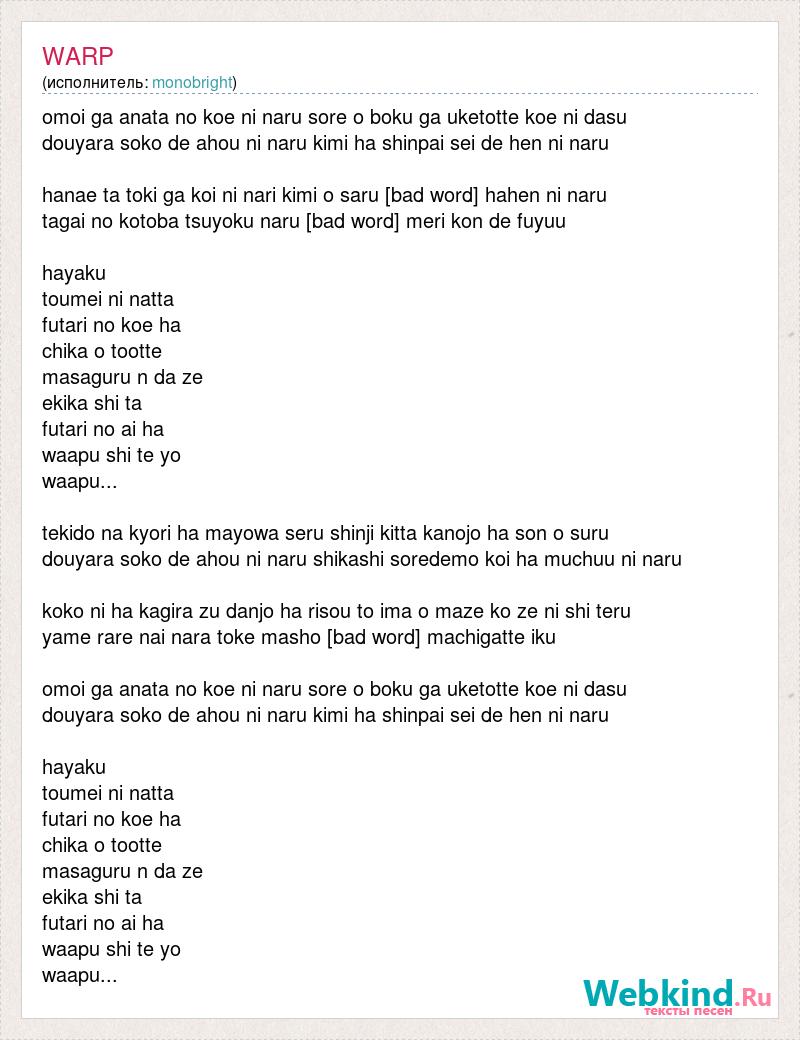 omoi ga anata no koe ni [bad word] sore o boku ga uketotte koe ni dasu douyara soko de ahou ni [bad word] kimi ha shinpai sei de hen ni [bad word] hanae ta toki ga koi ni nari kimi o [bad word] [bad word] hahen ni [bad word] tagai no kotoba tsuyoku [bad word] [bad word] meri kon de fuyuu hayaku toumei ni natta futari no koe ha chika o tootte [bad word] n da ze ekika shi ta futari no ai ha waapu shi te yo waapu... tekido na kyori ha mayowa [bad word] shinji kitta kanojo ha son o [bad word] douyara soko de ahou ni [bad word] shikashi soredemo koi ha muchuu ni [bad word] koko ni ha kagira zu danjo ha risou to ima o maze ko ze ni shi [bad word] yame rare nai nara toke masho [bad word] machigatte iku omoi ga anata no koe ni [bad word] sore o boku ga uketotte koe ni dasu douyara soko de ahou ni [bad word] kimi ha shinpai sei de hen ni [bad word] hayaku toumei ni natta futari no koe ha chika o tootte [bad word] n da ze ekika shi ta futari no ai ha waapu shi te yo waapu...