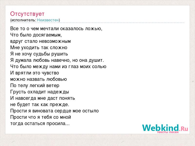 Все то о чем мечтали оказалось ложью, Что было досягаемым, вдруг стало невозможным Мне уходить так сложно Я не хочу судьбы рушить Я думала любовь навечно, но она душит. Что было между нами из глаз моих солью И врятли это чувство можно назвать любовью По телу легкий ветер Грусть охладит надежды И навсегда мне даст понять не будет так как прежде. Прости я виновата сердце мое остыло Прости что я тебя со мной тогда остаться просила...