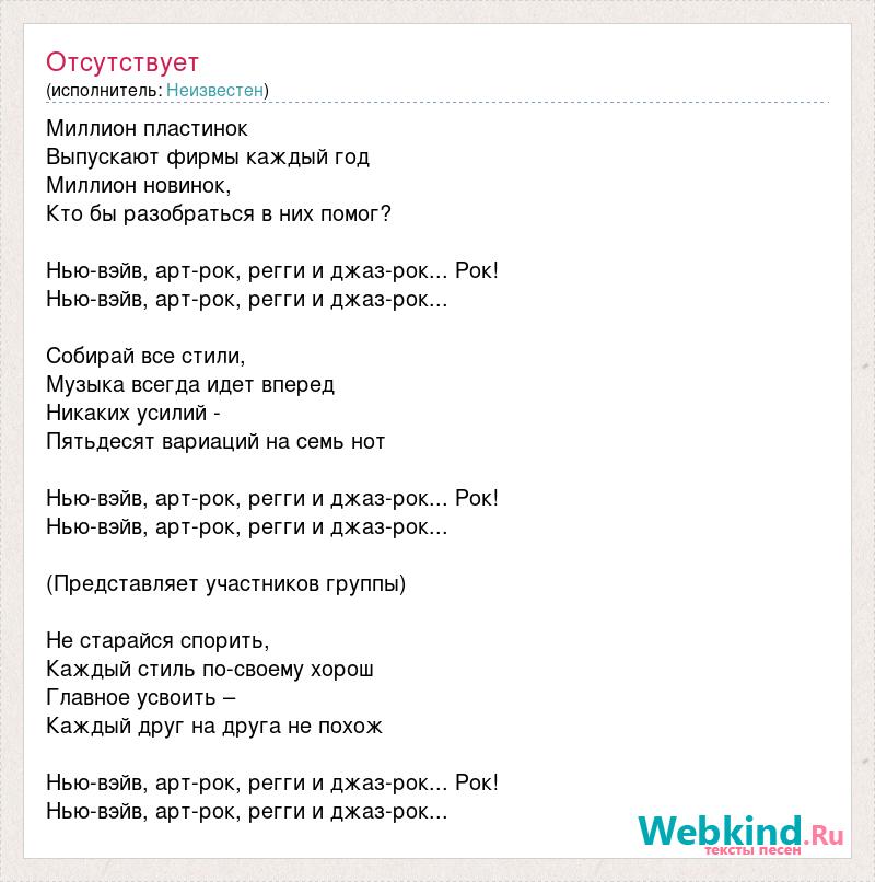 Миллион пластинок Выпускают фирмы каждый год Миллион новинок, Кто бы разобраться в них помог? Нью-вэйв, арт-рок, регги и джаз-рок... Рок! Нью-вэйв, арт-рок, регги и джаз-рок... Собирай все стили, Музыка всегда идет вперед Никаких усилий - Пятьдесят вариаций на семь нот Нью-вэйв, арт-рок, регги и джаз-рок... Рок! Нью-вэйв, арт-рок, регги и джаз-рок... (Представляет участников группы) Не старайся спорить, Каждый стиль по-своему хорош Главное усвоить – Каждый друг на друга не похож Нью-вэйв, арт-рок, регги и джаз-рок... Рок! Нью-вэйв, арт-рок, регги и джаз-рок...