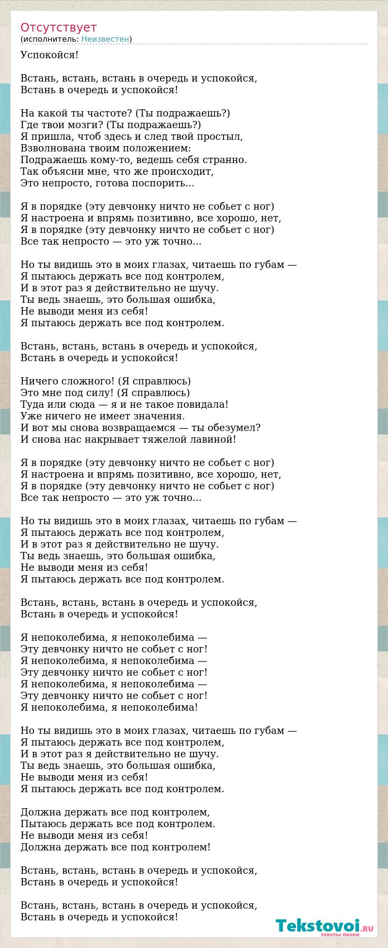 Успокойся! Встань, встань, встань в очередь и успокойся, Встань в очередь и успокойся! На какой ты частоте? (Ты подражаешь?) Где твои мозги? (Ты подражаешь?) Я пришла, чтоб здесь и след твой простыл, Взволнована твоим положением: Подражаешь кому-то, ведешь себя странно. Так объясни мне, что же происходит, Это непросто, готова поспорить... Я в порядке (эту девчонку ничто не собьет с ног) Я настроена и впрямь позитивно, все хорошо, нет, Я в порядке (эту девчонку ничто не собьет с ног) Все так непросто — это уж точно... Но ты видишь это в моих глазах, читаешь по губам — Я пытаюсь держать все под контролем, И в этот раз я действительно не шучу. Ты ведь знаешь, это большая ошибка, Не выводи меня из себя! Я пытаюсь держать все под контролем. Встань, встань, встань в очередь и успокойся, Встань в очередь и успокойся! Ничего сложного! (Я справлюсь) Это мне под силу! (Я справлюсь) Туда или сюда — я и не такое повидала! Уже ничего не имеет значения. И вот мы снова возвращаемся — ты обезумел? И снова нас накрывает тяжелой лавиной! Я в порядке (эту девчонку ничто не собьет с ног) Я настроена и впрямь позитивно, все хорошо, нет, Я в порядке (эту девчонку ничто не собьет с ног) Все так непросто — это уж точно... Но ты видишь это в моих глазах, читаешь по губам — Я пытаюсь держать все под контролем, И в этот раз я действительно не шучу. Ты ведь знаешь, это большая ошибка, Не выводи меня из себя! Я пытаюсь держать все под контролем. Встань, встань, встань в очередь и успокойся, Встань в очередь и успокойся! Я непоколебима, я непоколебима — Эту девчонку ничто не собьет с ног! Я непоколебима, я непоколебима — Эту девчонку ничто не собьет с ног! Я непоколебима, я непоколебима — Эту девчонку ничто не собьет с ног! Я непоколебима, я непоколебима! Но ты видишь это в моих глазах, читаешь по губам — Я пытаюсь держать все под контролем, И в этот раз я действительно не шучу. Ты ведь знаешь, это большая ошибка, Не выводи меня из себя! Я пытаюсь держать все под контролем. Должна держать все под контролем, Пытаюсь держать все под контролем. Не выводи меня из себя! Должна держать все под контролем! Встань, встань, встань в очередь и успокойся, Встань в очередь и успокойся! Встань, встань, встань в очередь и успокойся, Встань в очередь и успокойся!