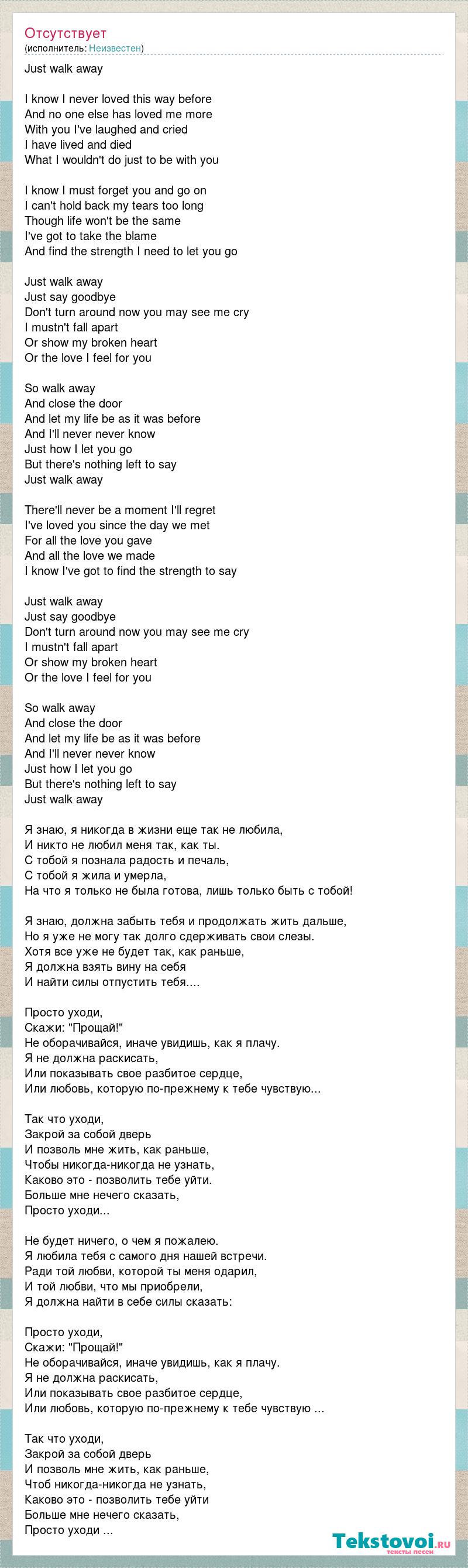 Just walk away I know I never loved this way before And no one else has loved me more With you I've laughed and cried I have lived and died What I wouldn't do just to be with you I know I must forget you and go on I can't hold back my tears too long Though life won't be the same I've got to take the blame And find the strength I need to let you go Just walk away Just say goodbye Don't turn around now you may see me cry I mustn't fall apart Or show my broken heart Or the love I feel for you So walk away And close the door And let my life be as it was before And I'll never never know Just how I let you go But there's nothing left to say Just walk away There'll never be a moment I'll regret I've loved you since the day we met For all the love you gave And all the love we made I know I've got to find the strength to say Just walk away Just say goodbye Don't turn around now you may see me cry I mustn't fall apart Or show my broken heart Or the love I feel for you So walk away And close the door And let my life be as it was before And I'll never never know Just how I let you go But there's nothing left to say Just walk away Я знаю, я никогда в жизни еще так не любила, И никто не любил меня так, как ты. С тобой я познала радость и печаль, С тобой я жила и умерла, На что я только не была готова, лишь только быть с тобой! Я знаю, должна забыть тебя и продолжать жить дальше, Но я уже не могу так долго сдерживать свои слезы. Хотя все уже не будет так, как раньше, Я должна взять вину на себя И найти силы отпустить тебя.... Просто уходи, Скажи: "Прощай!" Не оборачивайся, иначе увидишь, как я плачу. Я не должна раскисать, Или показывать свое разбитое сердце, Или любовь, которую по-прежнему к тебе чувствую... Так что уходи, Закрой за собой дверь И позволь мне жить, как раньше, Чтобы никогда-никогда не узнать, Каково это - позволить тебе уйти. Больше мне нечего сказать, Просто уходи... Не будет ничего, о чем я пожалею. Я любила тебя с самого дня нашей встречи. Ради той любви, которой ты меня одарил, И той любви, что мы приобрели, Я должна найти в себе силы сказать: Просто уходи, Скажи: "Прощай!" Не оборачивайся, иначе увидишь, как я плачу. Я не должна раскисать, Или показывать свое разбитое сердце, Или любовь, которую по-прежнему к тебе чувствую ... Так что уходи, Закрой за собой дверь И позволь мне жить, как раньше, Чтоб никогда-никогда не узнать, Каково это - позволить тебе уйти Больше мне нечего сказать, Просто уходи ...