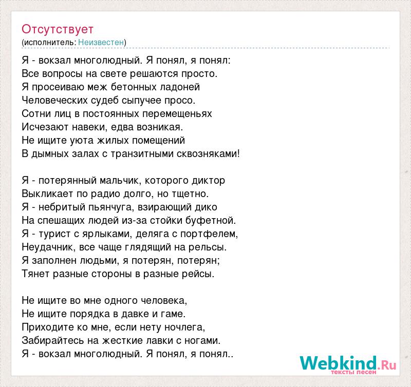 Я - вокзал многолюдный. Я понял, я понял: Все вопросы на свете решаются просто. Я просеиваю меж бетонных ладоней Человеческих судеб сыпучее просо. Сотни лиц в постоянных перемещеньях Исчезают навеки, едва возникая. Не ищите уюта жилых помещений В дымных залах с транзитными сквозняками! Я - потерянный мальчик, которого диктор Выкликает по радио долго, но тщетно. Я - небритый пьянчуга, взирающий дико На спешащих людей из-за стойки буфетной. Я - турист с ярлыками, деляга с портфелем, Неудачник, все чаще глядящий на рельсы. Я заполнен людьми, я потерян, потерян; Тянет разные стороны в разные рейсы. Не ищите во мне одного человека, Не ищите порядка в давке и гаме. Приходите ко мне, если нету ночлега, Забирайтесь на жесткие лавки с ногами. Я - вокзал многолюдный. Я понял, я понял..