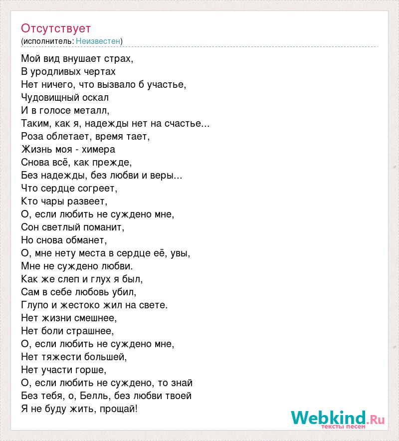 Мой вид внушает страх, В уродливых чертах Нет ничего, что вызвало б участье, Чудовищный оскал И в голосе металл, Таким, как я, надежды нет на счастье... Роза облетает, время тает, Жизнь моя - химера Снова всё, как прежде, Без надежды, без любви и веры... Что сердце согреет, Кто чары развеет, О, если любить не суждено мне, Сон светлый поманит, Но снова обманет, О, мне нету места в сердце её, увы, Мне не суждено любви. Как же слеп и глух я был, Сам в себе любовь убил, Глупо и жестоко жил на свете. Нет жизни смешнее, Нет боли страшнее, О, если любить не суждено мне, Нет тяжести большей, Нет участи горше, О, если любить не суждено, то знай Без тебя, о, Белль, без любви твоей Я не буду жить, прощай!