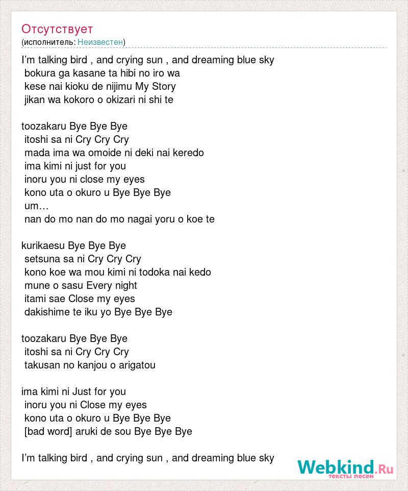 I’m talking bird , and crying sun , and dreaming blue sky bokura ga kasane ta hibi no iro wa kese nai kioku de nijimu My Story jikan wa kokoro o okizari ni shi te [bad word] Bye Bye Bye itoshi sa ni Cry Cry Cry mada ima wa omoide ni deki nai keredo ima kimi ni just for you [bad word] you ni close my eyes kono uta o okuro u Bye Bye Bye um… nan do mo nan do mo nagai [bad word] o koe te kurikaesu Bye Bye Bye setsuna sa ni Cry Cry Cry kono koe wa mou kimi ni todoka nai kedo mune o sasu Every night itami sae Close my eyes dakishime te iku yo Bye Bye Bye [bad word] Bye Bye Bye itoshi sa ni Cry Cry Cry takusan no kanjou o arigatou ima kimi ni Just for you [bad word] you ni Close my eyes kono uta o okuro u Bye Bye Bye [bad word] [bad word] de sou Bye Bye Bye I’m talking bird , and crying sun , and dreaming blue sky