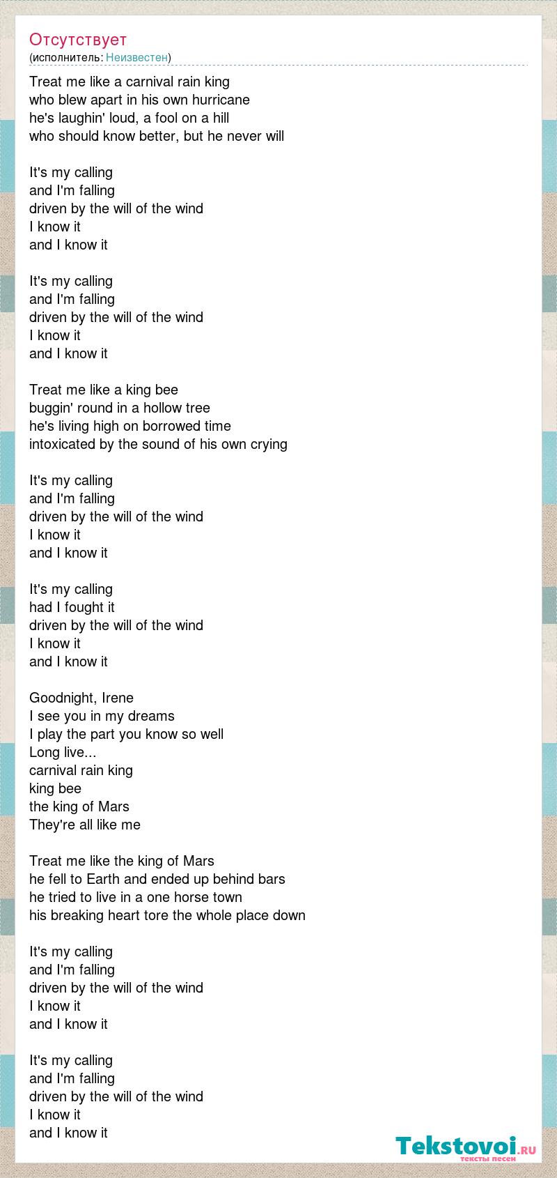 Treat me like a carnival rain king who blew apart in his own hurricane he's laughin' loud, a fool on a hill who should know better, but he never will It's my calling and I'm falling driven by the will of the wind I know it and I know it It's my calling and I'm falling driven by the will of the wind I know it and I know it Treat me like a king bee buggin' round in a hollow tree he's living high on borrowed time intoxicated by the sound of his own crying It's my calling and I'm falling driven by the will of the wind I know it and I know it It's my calling had I fought it driven by the will of the wind I know it and I know it Goodnight, Irene I see you in my dreams I play the part you know so well Long live... carnival rain king king bee the king of Mars They're all like me Treat me like the king of Mars he fell to Earth and ended up behind bars he tried to live in a one horse town his breaking heart tore the whole place down It's my calling and I'm falling driven by the will of the wind I know it and I know it It's my calling and I'm falling driven by the will of the wind I know it and I know it
