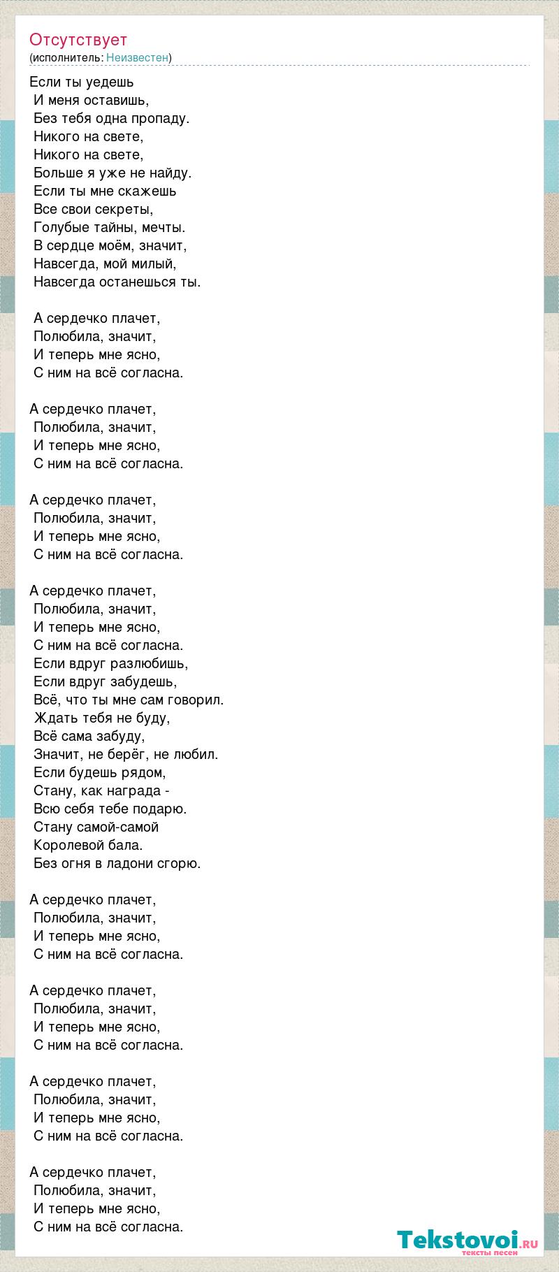 Если ты уедешь И меня оставишь, Без тебя одна пропаду. Никого на свете, Никого на свете, Больше я уже не найду. Если ты мне скажешь Все свои секреты, Голубые тайны, мечты. В сердце моём, значит, Навсегда, мой милый, Навсегда останешься ты. А сердечко плачет, Полюбила, значит, И теперь мне ясно, С ним на всё согласна. А сердечко плачет, Полюбила, значит, И теперь мне ясно, С ним на всё согласна. А сердечко плачет, Полюбила, значит, И теперь мне ясно, С ним на всё согласна. А сердечко плачет, Полюбила, значит, И теперь мне ясно, С ним на всё согласна. Если вдруг разлюбишь, Если вдруг забудешь, Всё, что ты мне сам говорил. Ждать тебя не буду, Всё сама забуду, Значит, не берёг, не любил. Если будешь рядом, Стану, как награда - Всю себя тебе подарю. Стану самой-самой Королевой бала. Без огня в ладони сгорю. А сердечко плачет, Полюбила, значит, И теперь мне ясно, С ним на всё согласна. А сердечко плачет, Полюбила, значит, И теперь мне ясно, С ним на всё согласна. А сердечко плачет, Полюбила, значит, И теперь мне ясно, С ним на всё согласна. А сердечко плачет, Полюбила, значит, И теперь мне ясно, С ним на всё согласна.