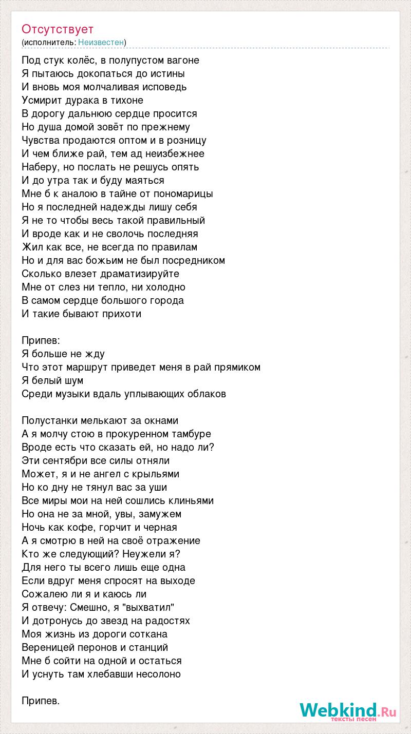 Под стук колёс, в полупустом вагоне Я пытаюсь докопаться до истины И вновь моя молчаливая исповедь Усмирит дурака в тихоне В дорогу дальнюю сердце просится Но душа домой зовёт по прежнему Чувства продаются оптом и в розницу И чем ближе рай, тем ад неизбежнее Наберу, но послать не решусь опять И до утра так и буду маяться Мне б к аналою в тайне от пономарицы Но я последней надежды лишу себя Я не то чтобы весь такой правильный И вроде как и не сволочь последняя Жил как все, не всегда по правилам Но и для вас божьим не был посредником Сколько влезет драматизируйте Мне от слез ни тепло, ни холодно В самом сердце большого города И такие бывают прихоти Припев: Я больше не жду Что этот маршрут приведет меня в рай прямиком Я белый шум Среди музыки вдаль уплывающих облаков Полустанки мелькают за окнами А я молчу стою в прокуренном тамбуре Вроде есть что сказать ей, но надо ли? Эти сентябри все силы отняли Может, я и не ангел с крыльями Но ко дну не тянул вас за уши Все миры мои на ней сошлись клиньями Но она не за мной, увы, замужем Ночь как кофе, горчит и черная А я смотрю в ней на своё отражение Кто же следующий? Неужели я? Для него ты всего лишь еще одна Если вдруг меня спросят на выходе Сожалею ли я и каюсь ли Я отвечу: Смешно, я "выхватил" И дотронусь до звезд на радостях Моя жизнь из дороги соткана Вереницей перонов и станций Мне б сойти на одной и остаться И уснуть там хлебавши несолоно Припев.