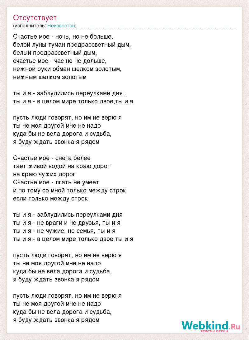 Счастье мое - ночь, но не больше, белой луны туман предрассветный дым, белый предрассветный дым, счастье мое - час но не дольше, нежной руки обман шелком золотым, нежным шелком золотым ты и я - заблудились переулками дня.. ты и я - в целом мире только двое,ты и я пусть люди говорят, но им не верю я ты не моя другой мне не надо куда бы не вела дорога и судьба, я буду ждать звонка я рядом Счастье мое - снега белее тает живой водой на краю дорог на краю чужих дорог Счастье мое - лгать не умеет и по тому со мной только между строк если только между строк ты и я - заблудились переулками дня ты и я - не враги и не друзья, ты и я ты и я - не чужие, не семья, ты и я ты и я - в целом мире только двое ты и я пусть люди говорят, но им не верю я ты не моя другой мне не надо куда бы не вела дорога и судьба, я буду ждать звонка я рядом пусть люди говорят, но им не верю я ты не моя другой мне не надо куда бы не вела дорога и судьба, я буду ждать звонка я рядом