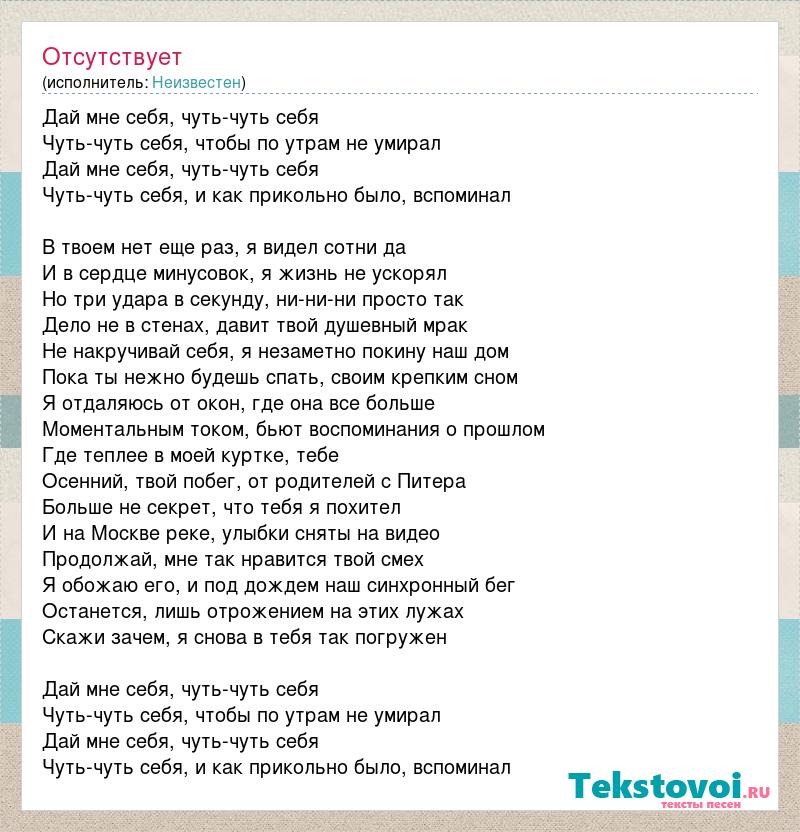 Дай мне себя, чуть-чуть себя Чуть-чуть себя, чтобы по утрам не умирал Дай мне себя, чуть-чуть себя Чуть-чуть себя, и как прикольно было, вспоминал В твоем нет еще раз, я видел сотни да И в сердце минусовок, я жизнь не ускорял Но три удара в секунду, ни-ни-ни просто так Дело не в стенах, давит твой душевный мрак Не накручивай себя, я незаметно покину наш дом Пока ты нежно будешь спать, своим крепким сном Я отдаляюсь от окон, где она все больше Моментальным током, бьют воспоминания о прошлом Где теплее в моей куртке, тебе Осенний, твой побег, от родителей с Питера Больше не секрет, что тебя я похител И на Москве реке, улыбки сняты на видео Продолжай, мне так нравится твой смех Я обожаю его, и под дождем наш синхронный бег Останется, лишь отрожением на этих лужах Скажи зачем, я снова в тебя так погружен Дай мне себя, чуть-чуть себя Чуть-чуть себя, чтобы по утрам не умирал Дай мне себя, чуть-чуть себя Чуть-чуть себя, и как прикольно было, вспоминал