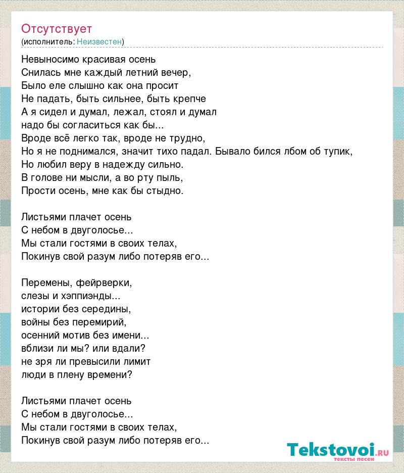 Невыносимо красивая осень Снилась мне каждый летний вечер, Было еле слышно как она просит Не падать, быть сильнее, быть крепче А я сидел и думал, лежал, стоял и думал надо бы согласиться как бы... Вроде всё легко так, вроде не трудно, Но я не поднимался, значит тихо падал. Бывало бился лбом об тупик, Но любил веру в надежду сильно. В голове ни мысли, а во рту пыль, Прости осень, мне как бы стыдно. Листьями плачет осень С небом в двуголосье... Мы стали гостями в своих телах, Покинув свой разум либо потеряв его... Перемены, фейрверки, слезы и хэппиэнды... истории без середины, войны без перемирий, осенний мотив без имени... вблизи ли мы? или вдали? не зря ли превысили лимит люди в плену времени? Листьями плачет осень С небом в двуголосье... Мы стали гостями в своих телах, Покинув свой разум либо потеряв его...