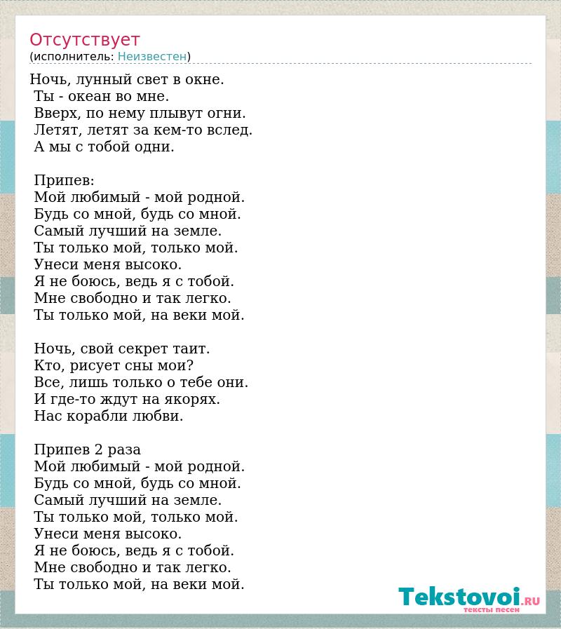 Ночь, лунный свет в окне. Ты - океан во мне. Вверх, по нему плывут огни. Летят, летят за кем-то вслед. А мы с тобой одни. Припев: Мой любимый - мой родной. Будь со мной, будь со мной. Самый лучший на земле. Ты только мой, только мой. Унеси меня высоко. Я не боюсь, ведь я с тобой. Мне свободно и так легко. Ты только мой, на веки мой. Ночь, свой секрет таит. Кто, рисует сны мои? Все, лишь только о тебе они. И где-то ждут на якорях. Нас корабли любви. Припев 2 раза Мой любимый - мой родной. Будь со мной, будь со мной. Самый лучший на земле. Ты только мой, только мой. Унеси меня высоко. Я не боюсь, ведь я с тобой. Мне свободно и так легко. Ты только мой, на веки мой.