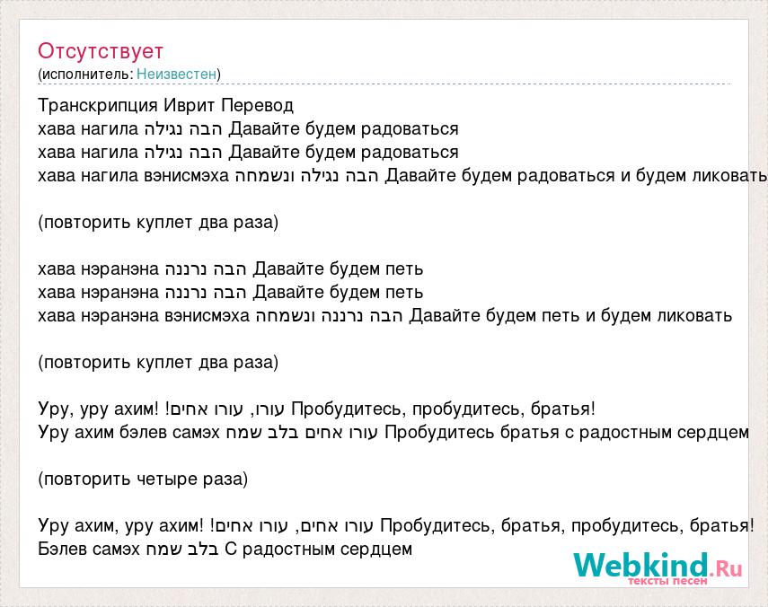 Транскрипция Иврит Перевод хава нагила הבה נגילה Давайте будем радоваться хава нагила הבה נגילה Давайте будем радоваться хава нагила вэнисмэха הבה נגילה ונשמחה Давайте будем радоваться и будем ликовать (повторить куплет два раза) хава нэранэна הבה נרננה Давайте будем петь хава нэранэна הבה נרננה Давайте будем петь хава нэранэна вэнисмэха הבה נרננה ונשמחה Давайте будем петь и будем ликовать (повторить куплет два раза) Уру, уру ахим! !עורו, עורו אחים Пробудитесь, пробудитесь, братья! Уру ахим бэлев самэх עורו אחים בלב שמח Пробудитесь братья с радостным сердцем (повторить четыре раза) Уру ахим, уру ахим! !עורו אחים, עורו אחים Пробудитесь, братья, пробудитесь, братья! Бэлев самэх בלב שמח С радостным сердцем