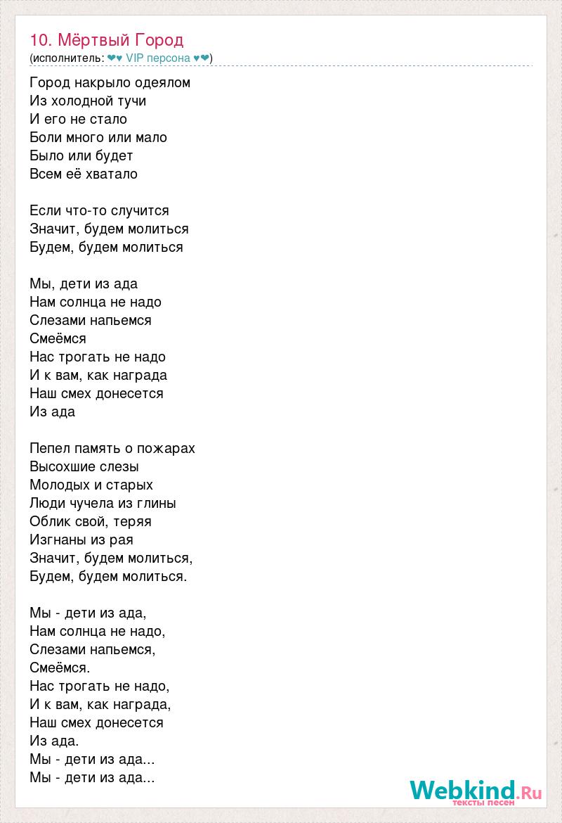 Город накрыло одеялом Из холодной тучи И его не стало Боли много или мало Было или будет Всем её хватало Если что-то случится Значит, будем молиться Будем, будем молиться Мы, дети из ада Нам солнца не надо Слезами напьемся Смеёмся Нас трогать не надо И к вам, как награда Наш смех донесется Из ада Пепел память о пожарах Высохшие слезы Молодых и старых Люди чучела из глины Облик свой, теряя Изгнаны из рая Значит, будем молиться, Будем, будем молиться. Мы - дети из ада, Нам солнца не надо, Слезами напьемся, Смеёмся. Нас трогать не надо, И к вам, как награда, Наш смех донесется Из ада. Мы - дети из ада... Мы - дети из ада...