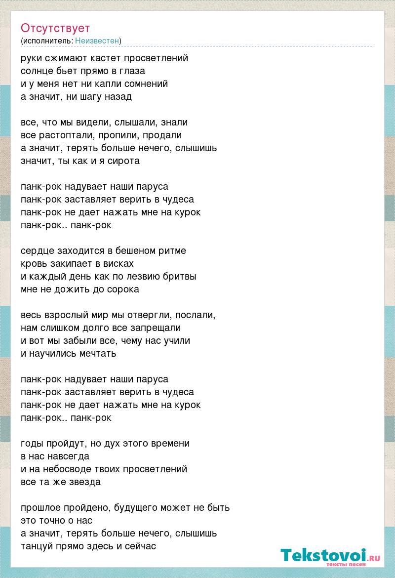 руки сжимают кастет просветлений солнце бьет прямо в глаза и у меня нет ни капли сомнений а значит, ни шагу назад все, что мы видели, слышали, знали все растоптали, пропили, продали а значит, терять больше нечего, слышишь значит, ты как и я сирота панк-рок надувает наши паруса панк-рок заставляет верить в чудеса панк-рок не дает нажать мне на курок панк-рок.. панк-рок сердце заходится в бешеном ритме кровь закипает в висках и каждый день как по лезвию бритвы мне не дожить до сорока весь взрослый мир мы отвергли, послали, нам слишком долго все запрещали и вот мы забыли все, чему нас учили и научились мечтать панк-рок надувает наши паруса панк-рок заставляет верить в чудеса панк-рок не дает нажать мне на курок панк-рок.. панк-рок годы пройдут, но дух этого времени в нас навсегда и на небосводе твоих просветлений все та же звезда прошлое пройдено, будущего может не быть это точно о нас а значит, терять больше нечего, слышишь танцуй прямо здесь и сейчас