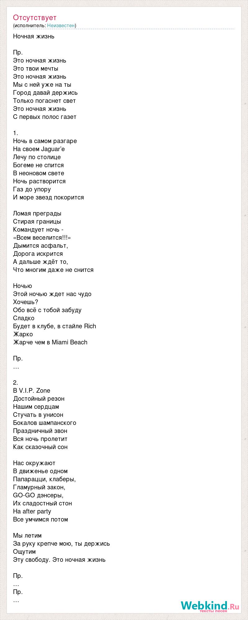 Ночная жизнь Пр. Это ночная жизнь Это твои мечты Это ночная жизнь Мы с ней уже на ты Город давай держись Только погаснет свет Это ночная жизнь С первых полос газет 1. Ночь в самом разгаре На своем Jaguar’e Лечу по столице Богеме не спится В неоновом свете Ночь растворится Газ до упору И море звезд покорится Ломая преграды Стирая границы Командует ночь - «Всем веселится!!!» Дымится асфальт, Дорога искрится А дальше ждёт то, Что многим даже не снится Ночью Этой ночью ждет нас чудо Хочешь? Обо всё с тобой забуду Сладко Будет в клубе, в стайле Rich Жарко Жарче чем в Miami Beach Пр. … 2. В V.I.P. Zone Достойный резон Нашим сердцам Стучать в унисон Бокалов шампанского Праздничный звон Вся ночь пролетит Как сказочный сон Нас окружают В движенье одном Папарацци, клаберы, Гламурный закон, GO-GO дэнсеры, Их сладостный стон На after party Все умчимся потом Мы летим За руку крепче мою, ты держись Ощутим Эту свободу. Это ночная жизнь Пр. … Пр. …