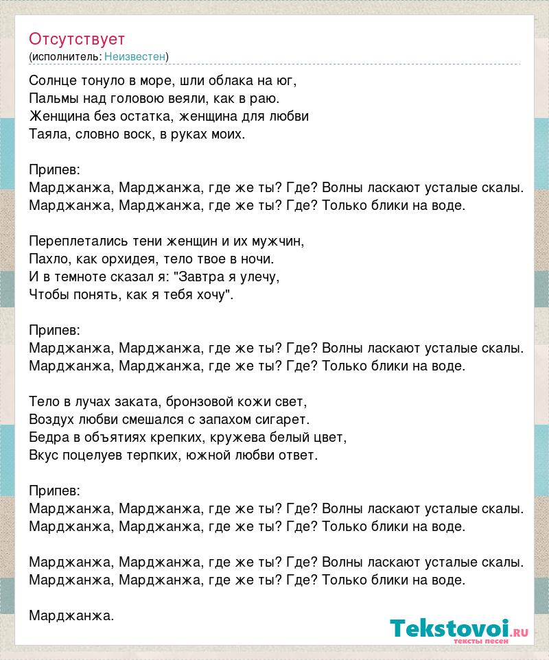 Солнце тонуло в море, шли облака на юг, Пальмы над головою веяли, как в раю. Женщина без остатка, женщина для любви Таяла, словно воск, в руках моих. Припев: Марджанжа, Марджанжа, где же ты? Где? Волны ласкают усталые скалы. Марджанжа, Марджанжа, где же ты? Где? Только блики на воде. Переплетались тени женщин и их мужчин, Пахло, как орхидея, тело твое в ночи. И в темноте сказал я: "Завтра я улечу, Чтобы понять, как я тебя хочу". Припев: Марджанжа, Марджанжа, где же ты? Где? Волны ласкают усталые скалы. Марджанжа, Марджанжа, где же ты? Где? Только блики на воде. Тело в лучах заката, бронзовой кожи свет, Воздух любви смешался с запахом сигарет. Бедра в объятиях крепких, кружева белый цвет, Вкус поцелуев терпких, южной любви ответ. Припев: Марджанжа, Марджанжа, где же ты? Где? Волны ласкают усталые скалы. Марджанжа, Марджанжа, где же ты? Где? Только блики на воде. Марджанжа, Марджанжа, где же ты? Где? Волны ласкают усталые скалы. Марджанжа, Марджанжа, где же ты? Где? Только блики на воде. Марджанжа.