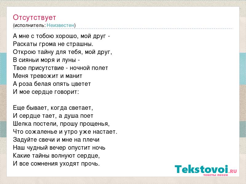 А мне с тобою хорошо, мой друг - Раскаты грома не страшны. Открою тайну для тебя, мой друг, В сияньи моря и луны - Твое присутствие - ночной полет Меня тревожит и манит А роза белая опять цветет И мое сердце говорит: Еще бывает, когда светает, И сердце тает, а душа поет Шелка постели, прошу прощенья, Что сожаленье и утро уже настает. Задуйте свечи и мне на плечи Наш чудный вечер опустит ночь Какие тайны волнуют сердце, И все сомнения уходят прочь.