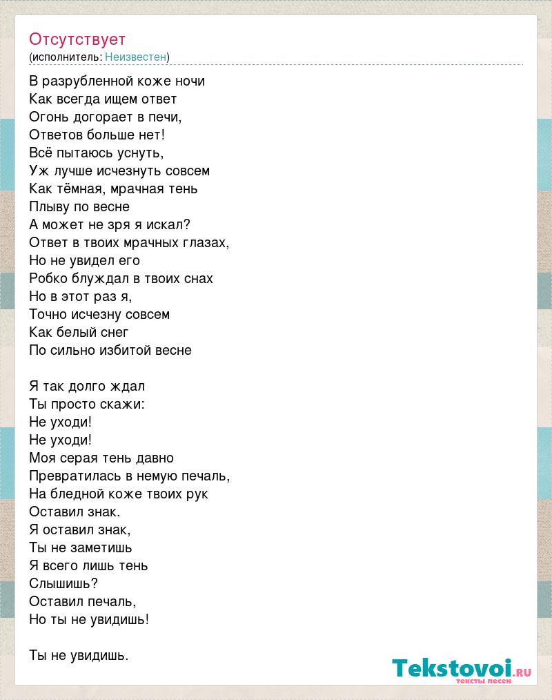 В разрубленной коже ночи Как всегда ищем ответ Огонь догорает в печи, Ответов больше нет! Всё пытаюсь уснуть, Уж лучше исчезнуть совсем Как тёмная, мрачная тень Плыву по весне А может не зря я искал? Ответ в твоих мрачных глазах, Но не увидел его Робко блуждал в твоих снах Но в этот раз я, Точно исчезну совсем Как белый снег По сильно избитой весне Я так долго ждал Ты просто скажи: Не уходи! Не уходи! Моя серая тень давно Превратилась в немую печаль, На бледной коже твоих рук Оставил знак. Я оставил знак, Ты не заметишь Я всего лишь тень Слышишь? Оставил печаль, Но ты не увидишь! Ты не увидишь.