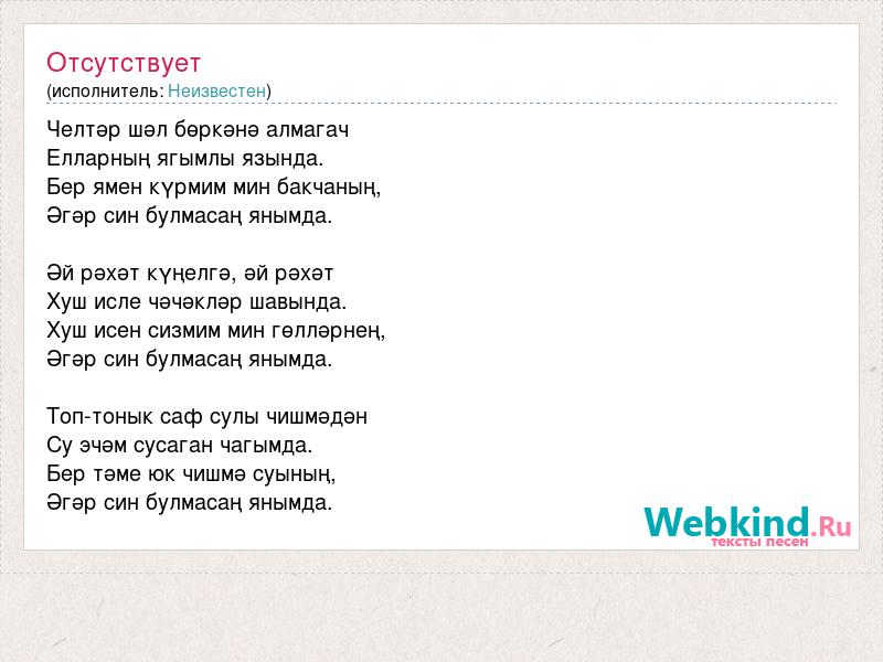Челтәр шәл бөркәнә алмагач Елларның ягымлы язында. Бер ямен күрмим мин бакчаның, Әгәр син булмасаң янымда. Әй рәхәт күңелгә, әй рәхәт Хуш исле чәчәкләр шавында. Хуш исен сизмим мин гөлләрнең, Әгәр син булмасаң янымда. Топ-тонык саф сулы чишмәдән Су эчәм сусаган чагымда. Бер тәме юк чишмә суының, Әгәр син булмасаң янымда.