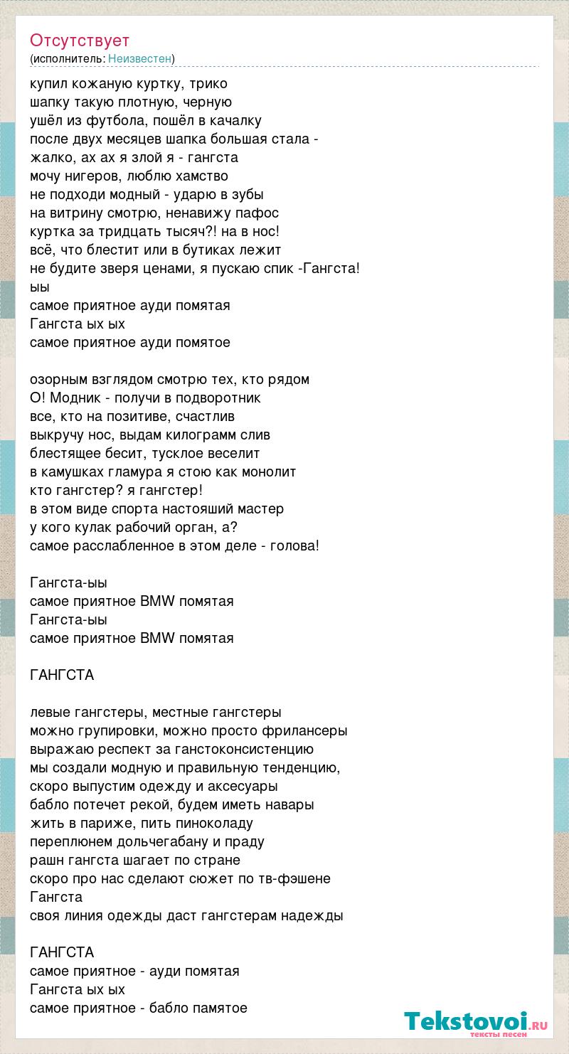 купил кожаную куртку, трико шапку такую плотную, черную ушёл из футбола, пошёл в качалку после двух месяцев шапка большая стала - жалко, ах ах я злой я - гангста мочу нигеров, люблю хамство не подходи модный - ударю в зубы на витрину смотрю, ненавижу пафос куртка за тридцать тысяч?! на в нос! всё, что блестит или в бутиках лежит не будите зверя ценами, я пускаю спик -Гангста! ыы самое приятное ауди помятая Гангста ых ых самое приятное ауди помятое озорным взглядом смотрю тех, кто рядом О! Модник - получи в подворотник все, кто на позитиве, счастлив выкручу нос, выдам килограмм слив блестящее бесит, тусклое веселит в камушках гламура я стою как монолит кто гангстер? я гангстер! в этом виде спорта настояший мастер у кого кулак рабочий орган, а? самое расслабленное в этом деле - голова! Гангста-ыы самое приятное BMW помятая Гангста-ыы самое приятное BMW помятая ГАНГСТА левые гангстеры, местные гангстеры можно групировки, можно просто фрилансеры выражаю респект за ганстоконсистенцию мы создали модную и правильную тенденцию, скоро выпустим одежду и аксесуары бабло потечет рекой, будем иметь навары жить в париже, пить пиноколаду переплюнем дольчегабану и праду рашн гангста шагает по стране скоро про нас сделают сюжет по тв-фэшене Гангста своя линия одежды даст гангстерам надежды ГАНГСТА самое приятное - ауди помятая Гангста ых ых самое приятное - бабло памятое