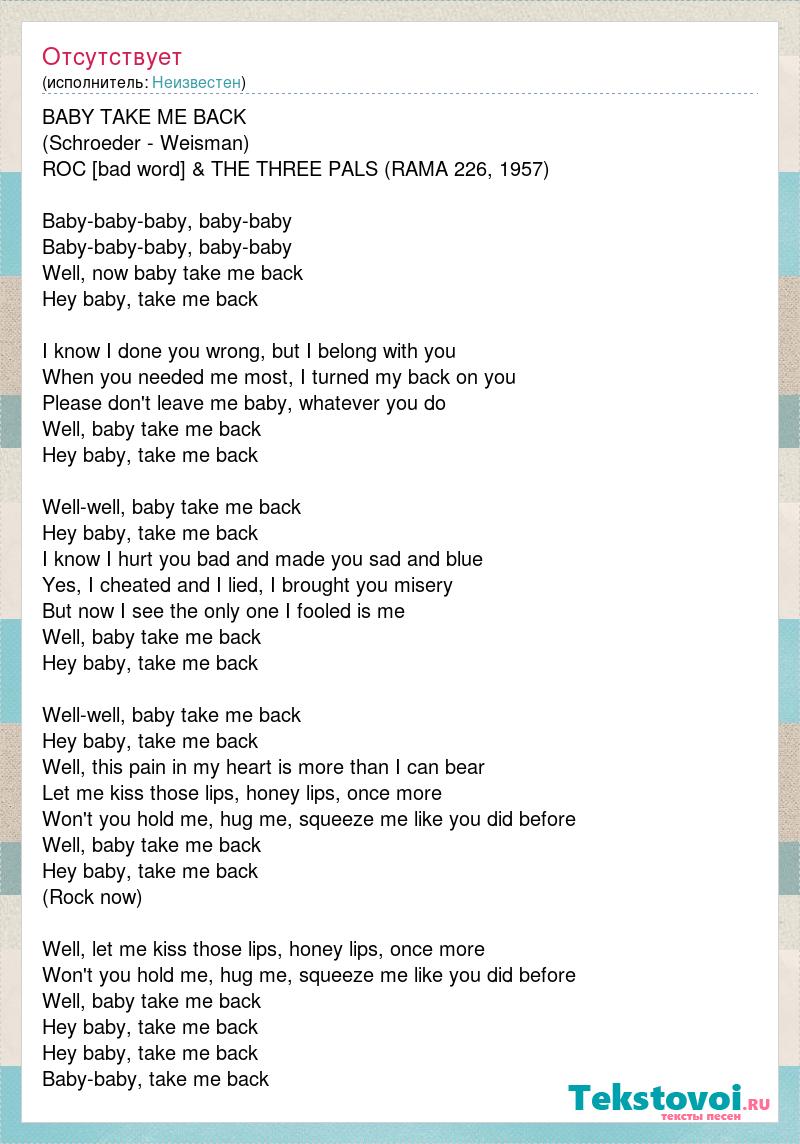 BABY TAKE ME BACK (Schroeder - Weisman) ROC [bad word] & THE THREE PALS (RAMA 226, 1957) Baby-baby-baby, baby-baby Baby-baby-baby, baby-baby Well, now baby take me back Hey baby, take me back I know I done you wrong, but I belong with you When you needed me most, I turned my back on you Please don't leave me baby, whatever you do Well, baby take me back Hey baby, take me back Well-well, baby take me back Hey baby, take me back I know I hurt you bad and made you sad and blue Yes, I cheated and I lied, I brought you misery But now I see the only one I fooled is me Well, baby take me back Hey baby, take me back Well-well, baby take me back Hey baby, take me back Well, this pain in my heart is more than I can bear Let me kiss those lips, honey lips, once more Won't you hold me, hug me, squeeze me like you did before Well, baby take me back Hey baby, take me back (Rock now) Well, let me kiss those lips, honey lips, once more Won't you hold me, hug me, squeeze me like you did before Well, baby take me back Hey baby, take me back Hey baby, take me back Baby-baby, take me back