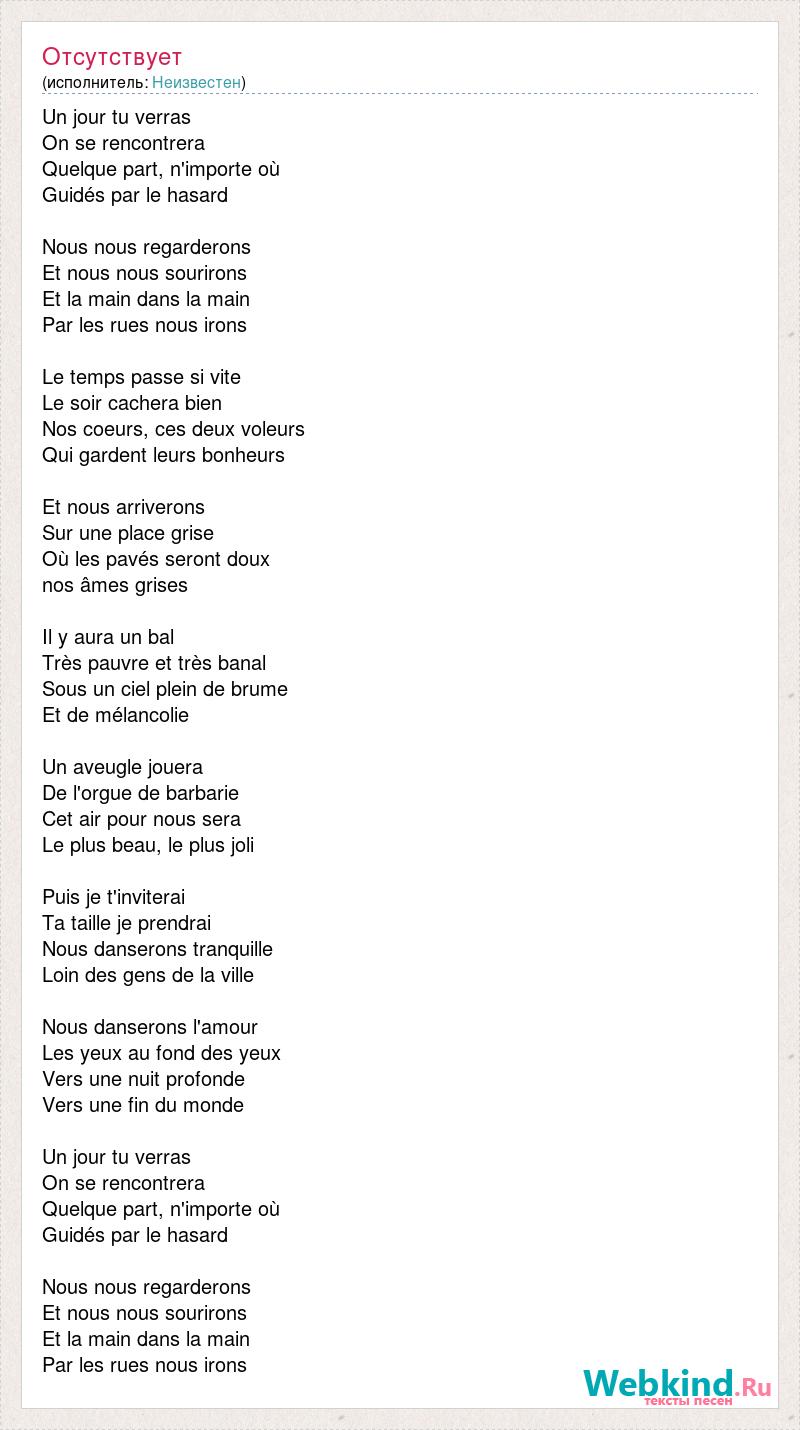 Un jour tu verras On se rencontrera Quelque part, n'importe où Guidés par le hasard Nous nous regarderons Et nous nous sourirons Et la main dans la main Par [bad word] nous irons Le temps passe si vite Le soir cachera bien Nos coeurs, ces deux voleurs Qui gardent leurs bonheurs Et nous arriverons Sur une place grise Où les pavés seront doux nos âmes grises Il y aura un bal Très pauvre et très banal Sous un ciel plein de [bad word] Et de mélancolie Un aveugle jouera De l'orgue de barbarie Cet air pour nous sera Le plus beau, le plus joli Puis je t'inviterai Ta taille je prendrai Nous danserons tranquille Loin des gens de la ville Nous danserons l'amour Les yeux au fond des yeux Vers une nuit profonde Vers une fin du monde Un jour tu verras On se rencontrera Quelque part, n'importe où Guidés par le hasard Nous nous regarderons Et nous nous sourirons Et la main dans la main Par [bad word] nous irons