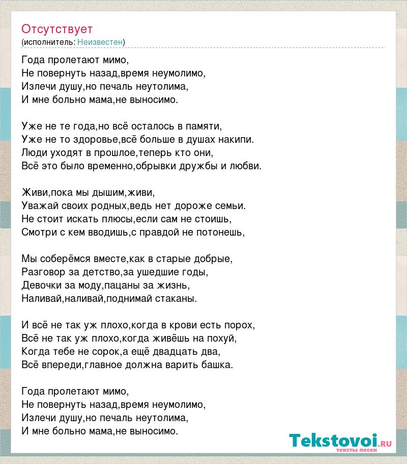 Года пролетают мимо, Не повернуть назад,время неумолимо, Излечи душу,но печаль неутолима, И мне больно мама,не выносимо. Уже не те года,но всё осталось в памяти, Уже не то здоровье,всё больше в душах накипи. Люди уходят в прошлое,теперь кто они, Всё это было временно,обрывки дружбы и любви. Живи,пока мы дышим,живи, Уважай своих родных,ведь нет дороже семьи. Не стоит искать плюсы,если сам не стоишь, Смотри с кем вводишь,с правдой не потонешь, Мы соберёмся вместе,как в старые добрые, Разговор за детство,за ушедшие годы, Девочки за моду,пацаны за жизнь, Наливай,наливай,поднимай стаканы. И всё не так уж плохо,когда в крови есть порох, Всё не так уж плохо,когда живёшь на похуй, Когда тебе не сорок,а ещё двадцать два, Всё впереди,главное должна варить башка. Года пролетают мимо, Не повернуть назад,время неумолимо, Излечи душу,но печаль неутолима, И мне больно мама,не выносимо.