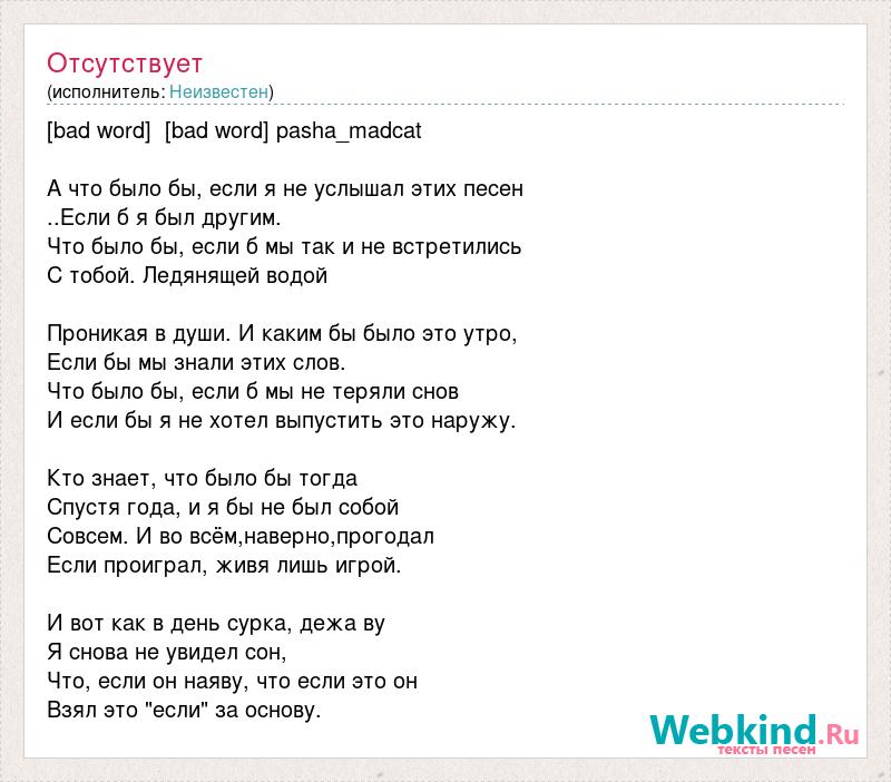 [bad word] [bad word] pasha_madcat А что было бы, если я не услышал этих песен ..Если б я был другим. Что было бы, если б мы так и не встретились С тобой. Ледянящей водой Проникая в души. И каким бы было это утро, Если бы мы знали этих слов. Что было бы, если б мы не теряли снов И если бы я не хотел выпустить это наружу. Кто знает, что было бы тогда Спустя года, и я бы не был собой Совсем. И во всём,наверно,прогодал Если проиграл, живя лишь игрой. И вот как в день сурка, дежа ву Я снова не увидел сон, Что, если он наяву, что если это он Взял это "если" за основу.