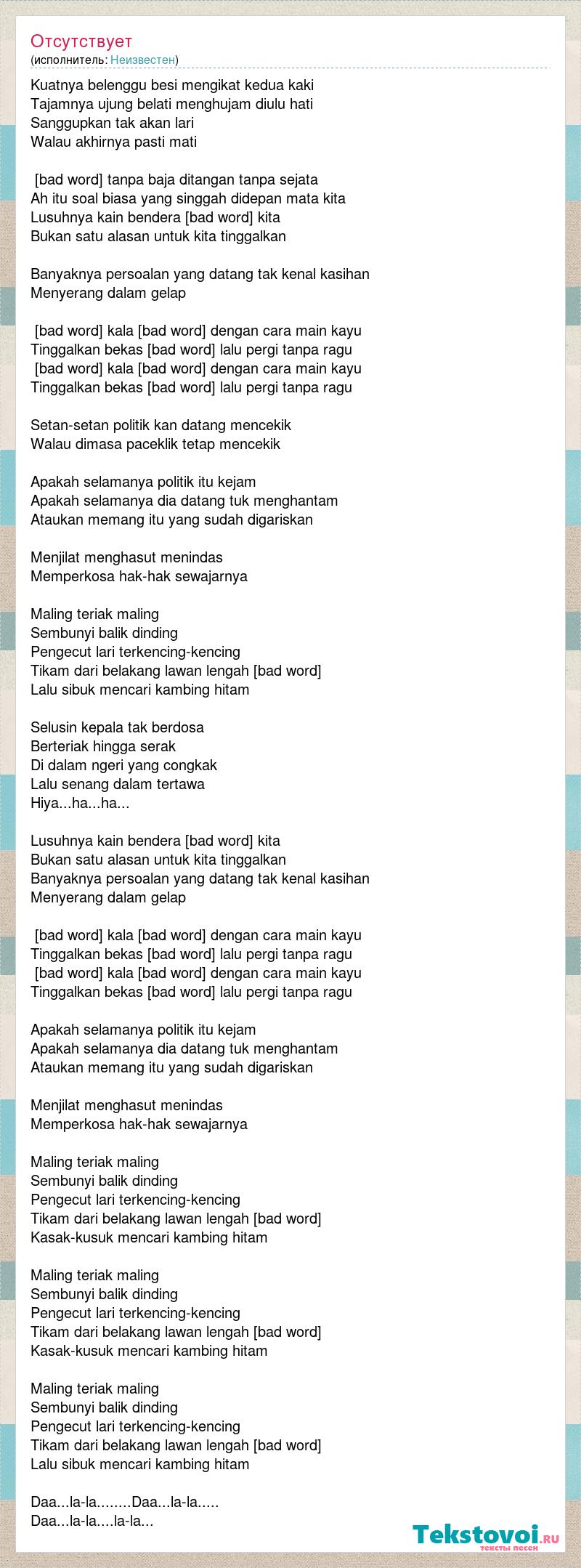 Kuatnya belenggu besi mengikat kedua kaki Tajamnya ujung belati menghujam diulu hati Sanggupkan tak akan lari Walau akhirnya pasti mati [bad word] tanpa baja ditangan tanpa sejata Ah itu soal biasa yang singgah didepan mata kita Lusuhnya kain bendera [bad word] kita Bukan satu alasan untuk kita tinggalkan Banyaknya persoalan yang datang tak kenal kasihan Menyerang dalam gelap [bad word] kala [bad word] dengan cara main kayu Tinggalkan bekas [bad word] lalu pergi tanpa ragu [bad word] kala [bad word] dengan cara main kayu Tinggalkan bekas [bad word] lalu pergi tanpa ragu Setan-setan politik kan datang mencekik Walau dimasa paceklik tetap mencekik Apakah selamanya politik itu kejam Apakah selamanya dia datang tuk menghantam Ataukan memang itu yang sudah digariskan Menjilat menghasut menindas Memperkosa hak-hak sewajarnya Maling teriak maling Sembunyi balik dinding Pengecut lari terkencing-kencing Tikam dari belakang lawan lengah [bad word] Lalu sibuk mencari kambing hitam Selusin kepala tak berdosa Berteriak hingga serak Di dalam ngeri yang congkak Lalu senang dalam tertawa Hiya...ha...ha... Lusuhnya kain bendera [bad word] kita Bukan satu alasan untuk kita tinggalkan Banyaknya persoalan yang datang tak kenal kasihan Menyerang dalam gelap [bad word] kala [bad word] dengan cara main kayu Tinggalkan bekas [bad word] lalu pergi tanpa ragu [bad word] kala [bad word] dengan cara main kayu Tinggalkan bekas [bad word] lalu pergi tanpa ragu Apakah selamanya politik itu kejam Apakah selamanya dia datang tuk menghantam Ataukan memang itu yang sudah digariskan Menjilat menghasut menindas Memperkosa hak-hak sewajarnya Maling teriak maling Sembunyi balik dinding Pengecut lari terkencing-kencing Tikam dari belakang lawan lengah [bad word] Kasak-kusuk mencari kambing hitam Maling teriak maling Sembunyi balik dinding Pengecut lari terkencing-kencing Tikam dari belakang lawan lengah [bad word] Kasak-kusuk mencari kambing hitam Maling teriak maling Sembunyi balik dinding Pengecut lari terkencing-kencing Tikam dari belakang lawan lengah [bad word] Lalu sibuk mencari kambing hitam Daa...la-la........Daa...la-la..... Daa...la-la....la-la...