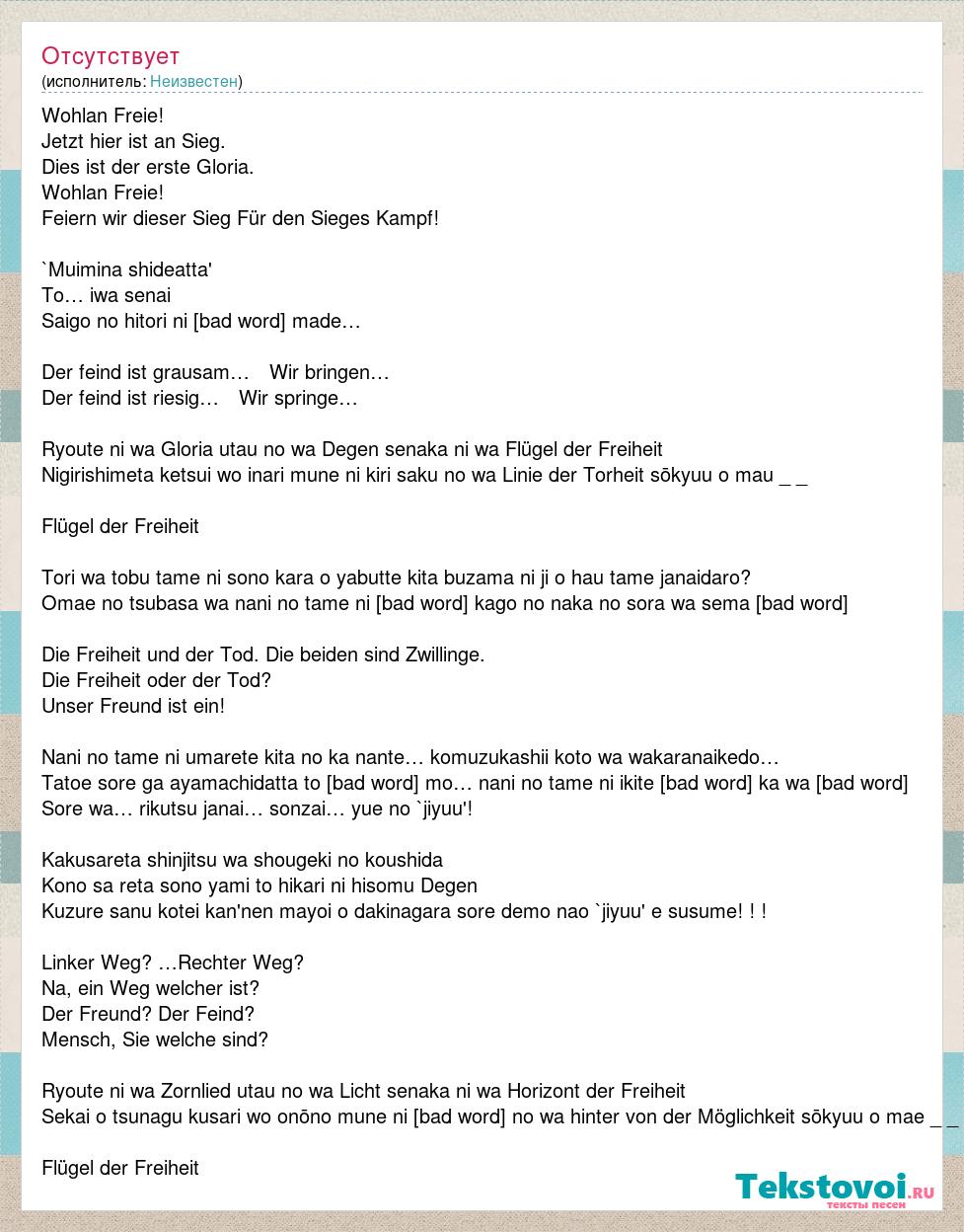 Wohlan Freie! Jetzt hier ist an Sieg. Dies ist der erste Gloria. Wohlan Freie! Feiern wir dieser Sieg Für den Sieges Kampf! `Muimina shideatta' To… iwa senai Saigo no hitori ni [bad word] made… Der feind ist grausam… Wir bringen… Der feind ist riesig… Wir springe… Ryoute ni wa Gloria utau no wa Degen senaka ni wa Flügel der Freiheit Nigirishimeta ketsui wo inari mune ni kiri saku no wa Linie der Torheit sōkyuu o mau _ _ Flügel der Freiheit Tori wa tobu tame ni sono kara o yabutte kita buzama ni ji o hau tame janaidaro? Omae no tsubasa wa nani no tame ni [bad word] kago no naka no sora wa sema [bad word] Die Freiheit und der Tod. Die beiden sind Zwillinge. Die Freiheit oder der Tod? Unser Freund ist ein! Nani no tame ni umarete kita no ka nante… komuzukashii koto wa wakaranaikedo… Tatoe sore ga ayamachidatta to [bad word] mo… nani no tame ni ikite [bad word] ka wa [bad word] Sore wa… rikutsu janai… sonzai… yue no `jiyuu'! Kakusareta shinjitsu wa shougeki no koushida Kono sa reta sono yami to hikari ni hisomu Degen Kuzure sanu kotei kan'nen mayoi o dakinagara sore demo nao `jiyuu' e susume! ! ! Linker Weg? …Rechter Weg? Na, ein Weg welcher ist? Der Freund? Der Feind? Mensch, Sie welche sind? Ryoute ni wa Zornlied utau no wa Licht senaka ni wa Horizont der Freiheit Sekai o tsunagu kusari wo onōno mune ni [bad word] no wa hinter von der Möglichkeit sōkyuu o mae _ _ Flügel der Freiheit