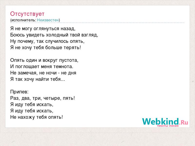 Я не могу оглянуться назад, Боюсь увидеть холодный твой взгляд, Ну почему, так случилось опять, Я не хочу тебя больше терять! Опять один и вокруг пустота, И поглощает меня темнота. Не замечая, не ночи - не дня Я так хочу найти тебя... Припев: Раз, два, три, четыре, пять! Я иду тебя искать, Я иду тебя искать, Не нахожу тебя опять!